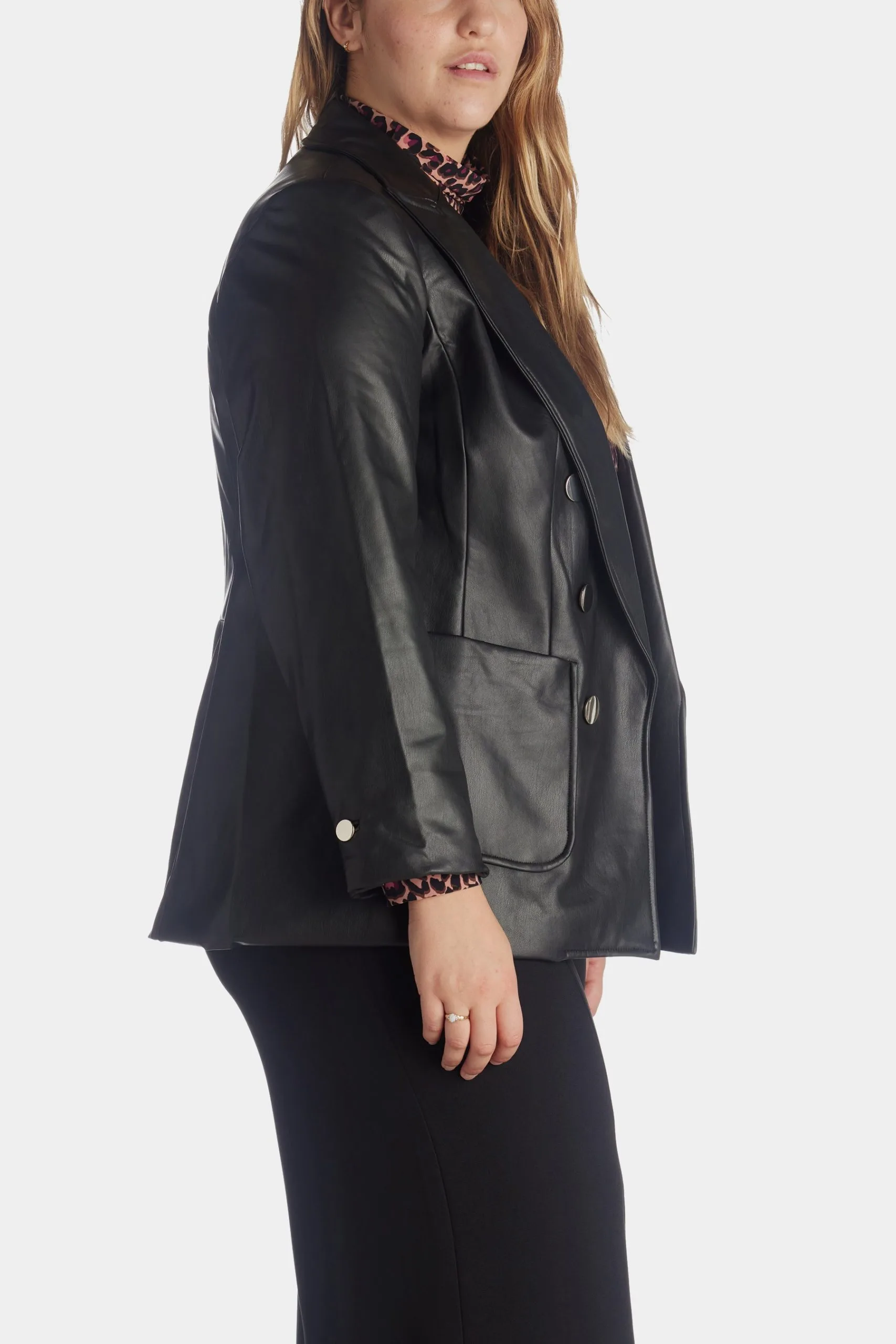 Classic with a modern feel. This vegan leather double-breasted jacket lends substance to your work-to-weekend wardrobe.