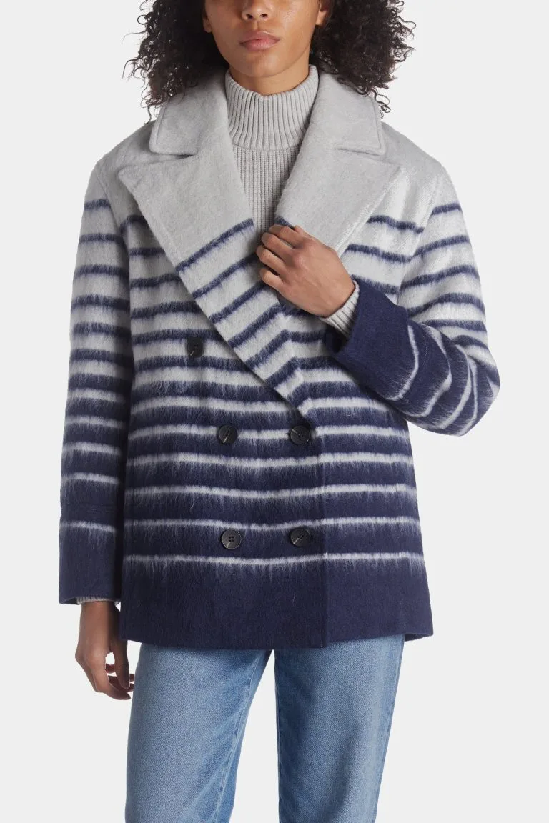 Variegated stripes enliven this wool-enriched peacoat designed with slouchy dropped shoulders and a double-breasted silhouette.