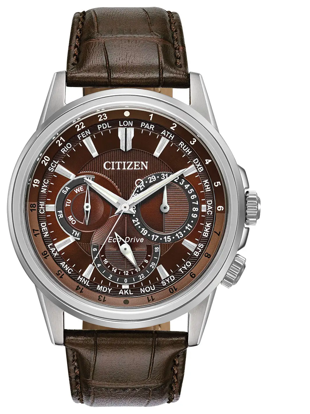 Bring sophistication to your day with the CITIZEN® Calendrier, powered by any light with Eco-Drive. This timeless watch features 12/24-hour time, world time in 24 cities and day/date. Men’s watch featured with stainless steel case, chocolate brown leather strap with matching brown dial. Featuring our Eco-Drive technology – powered by light, any light. Caliber number 8729.