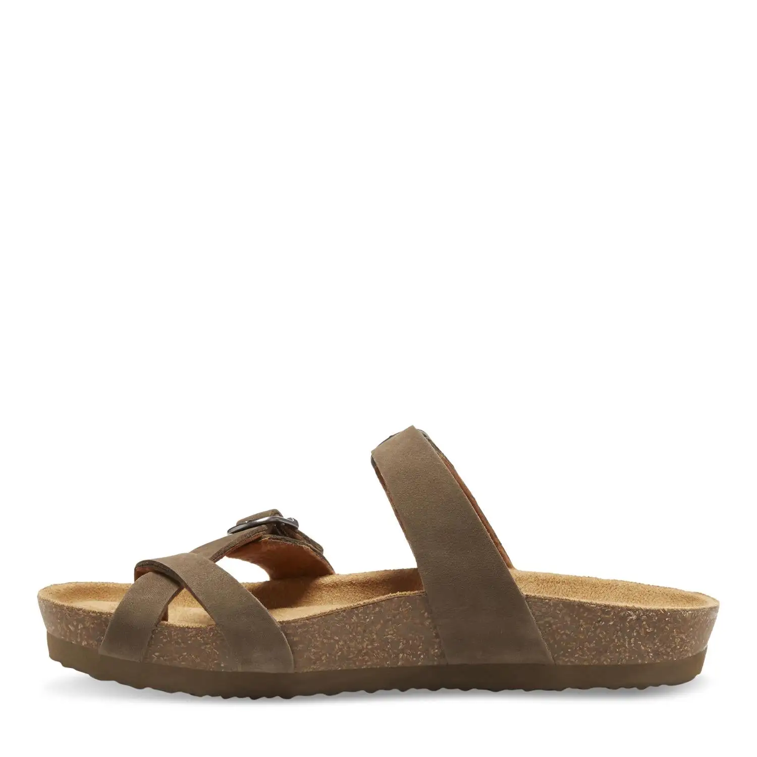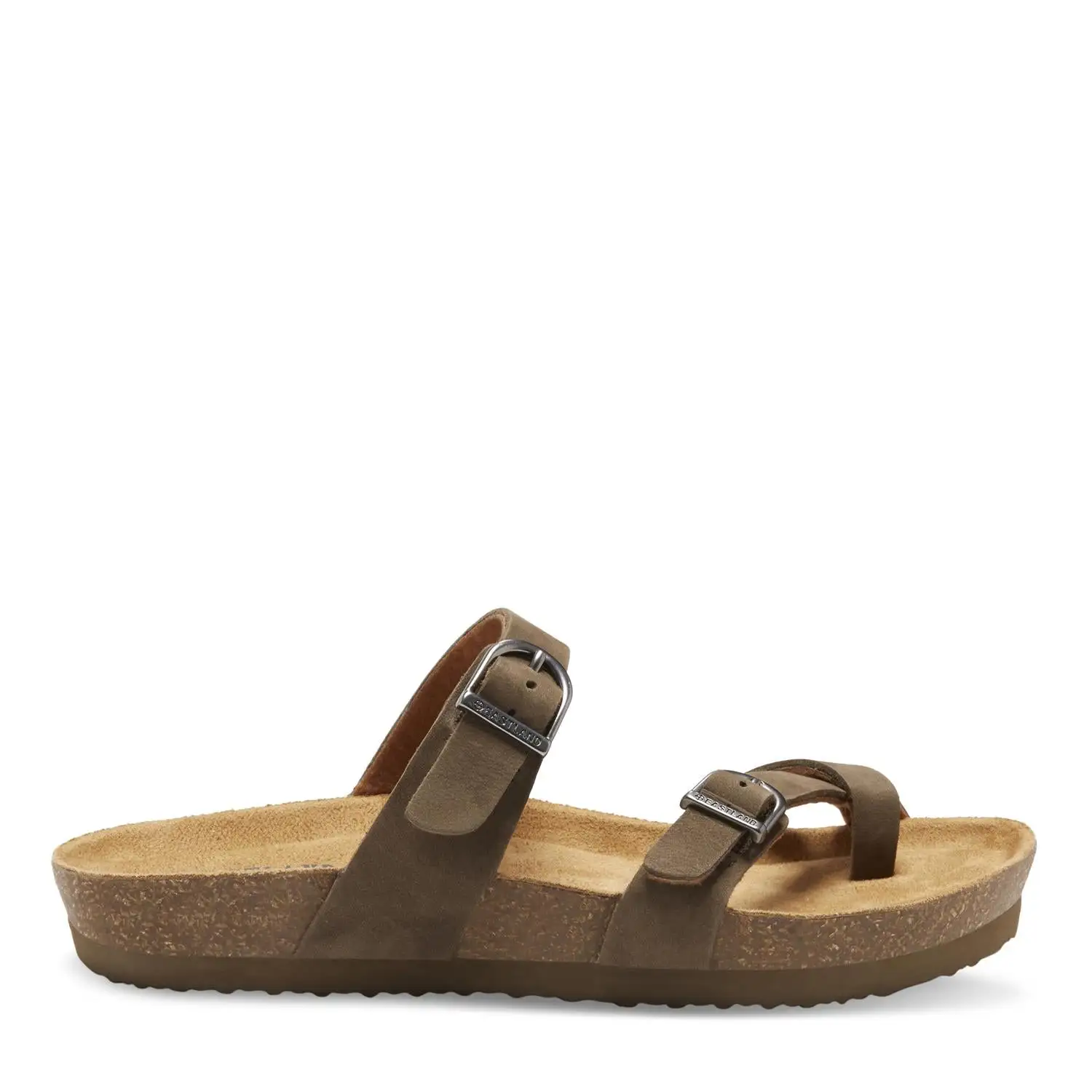 Soft nubuc leather upper with soft fabric lining for barefoot comfort. Adjustable strap and buckles provide a custom fit. Eastland Exclusive Active Memory Foam comfort insole supports and conforms to the curves of your foot. TPR and cork midsole. Durable, shock absorbing EVA outsole.