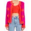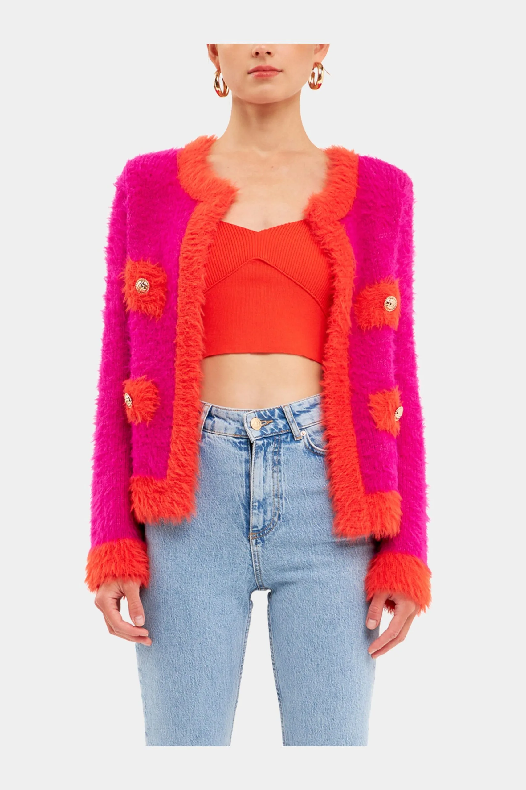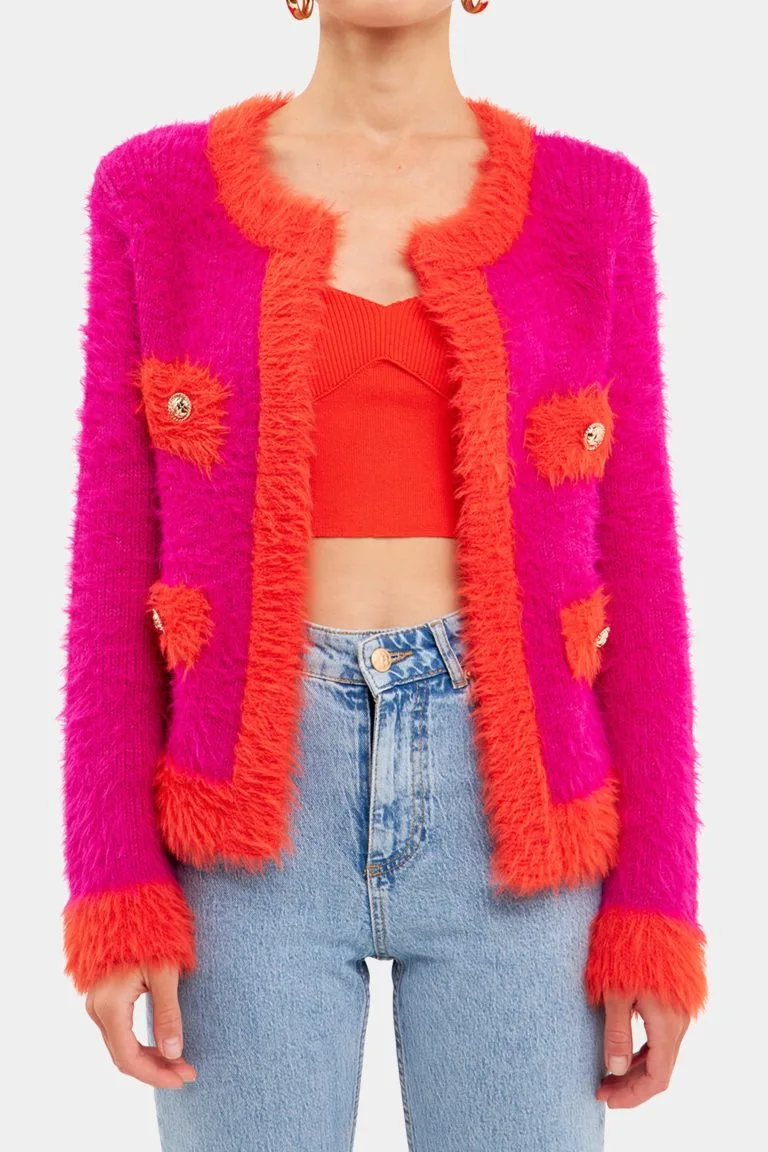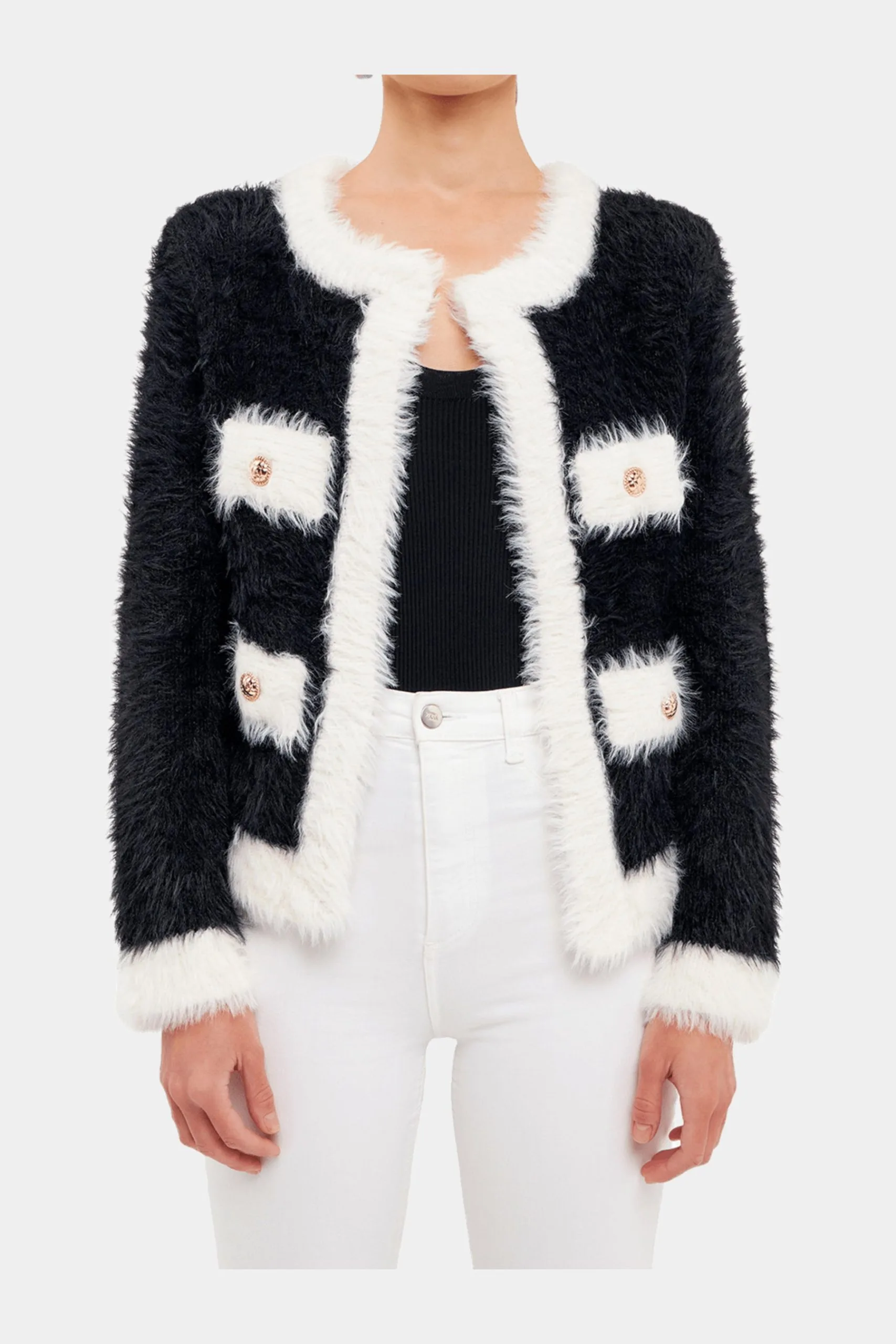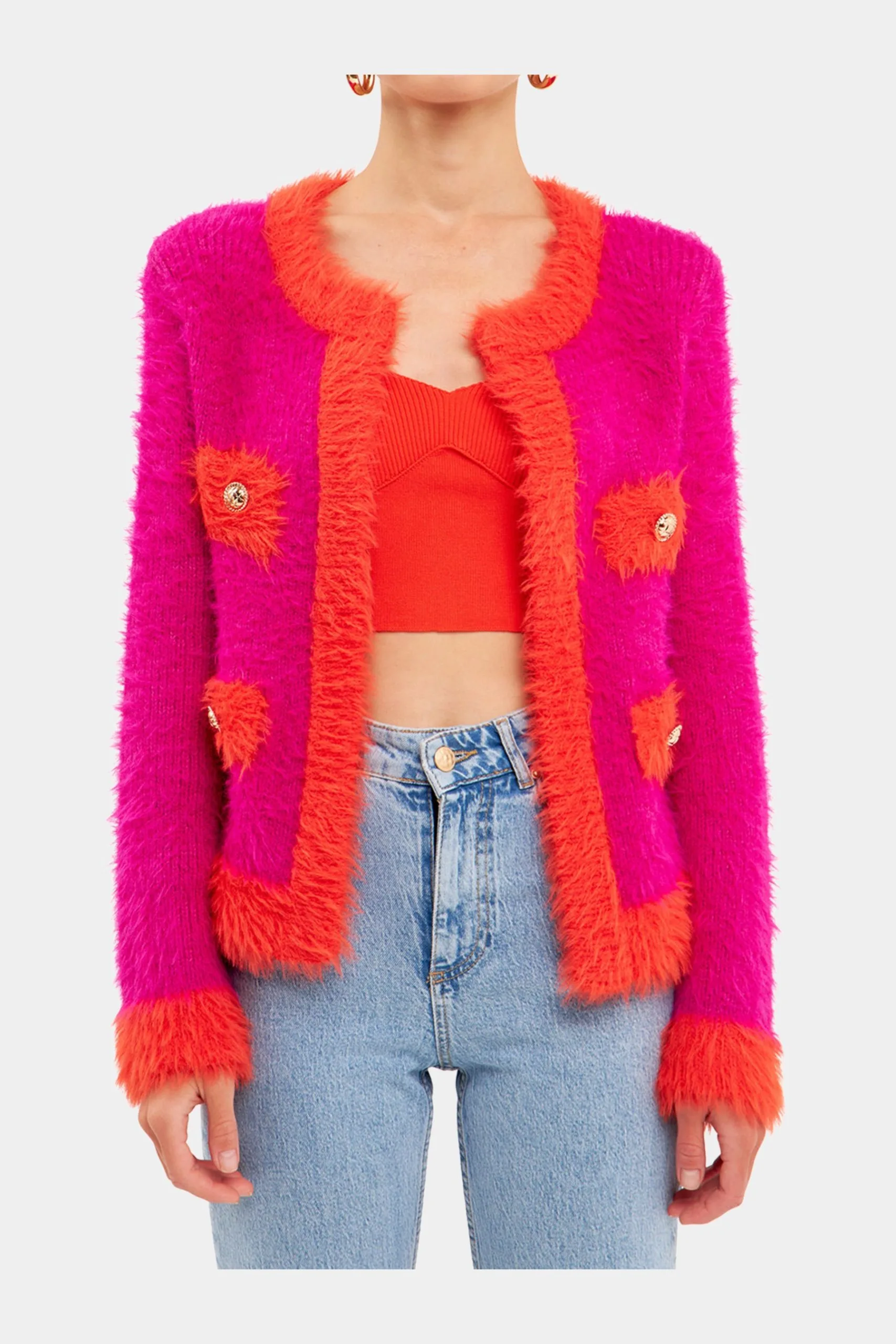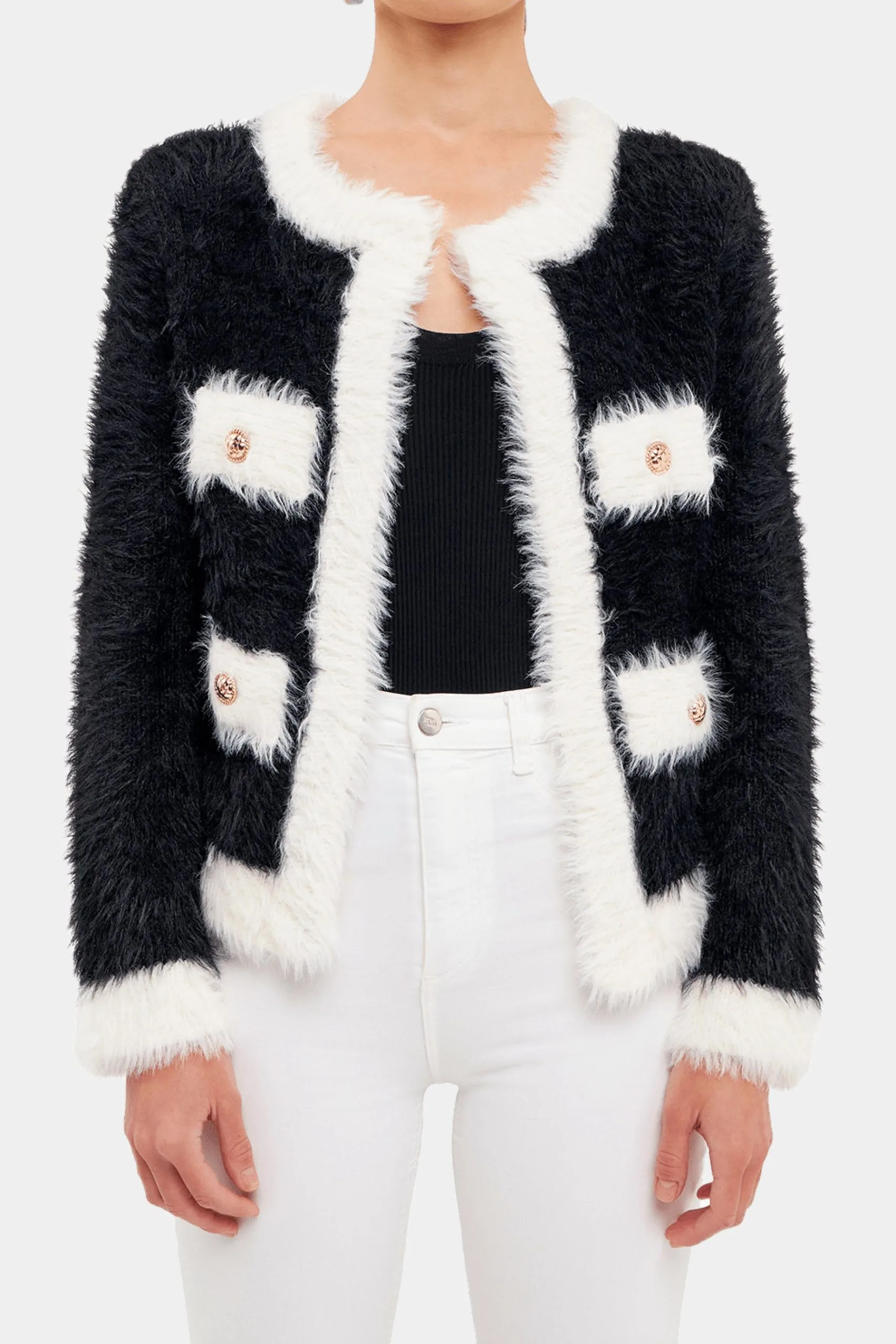 Fuzzy meets sophisticated, this colorblock cardigan features an open design and gold-tone shank buttons.