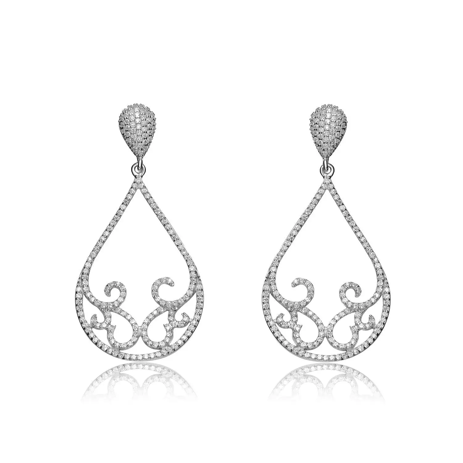 Stylish Sterling Silver Cubic Zirconia Peardrop Earrings. These elegant tear drop earrings feature swirl designs decorated with clear round-cut cubic zirconia stones.