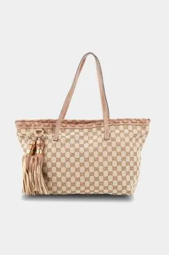 Crafted in the illustrious GG Canvas print in brown canvas, this Bamboo Tassel Tote Bag is a sophisticated shoulder bag from Gucci. It is effortlessly classy thanks to its distinctive bamboo tassel embellishment and braided leather trim on top, making the bag eye-catching and mesmerizing. Unless otherwise stated, the item does not come with original brand accessories.
