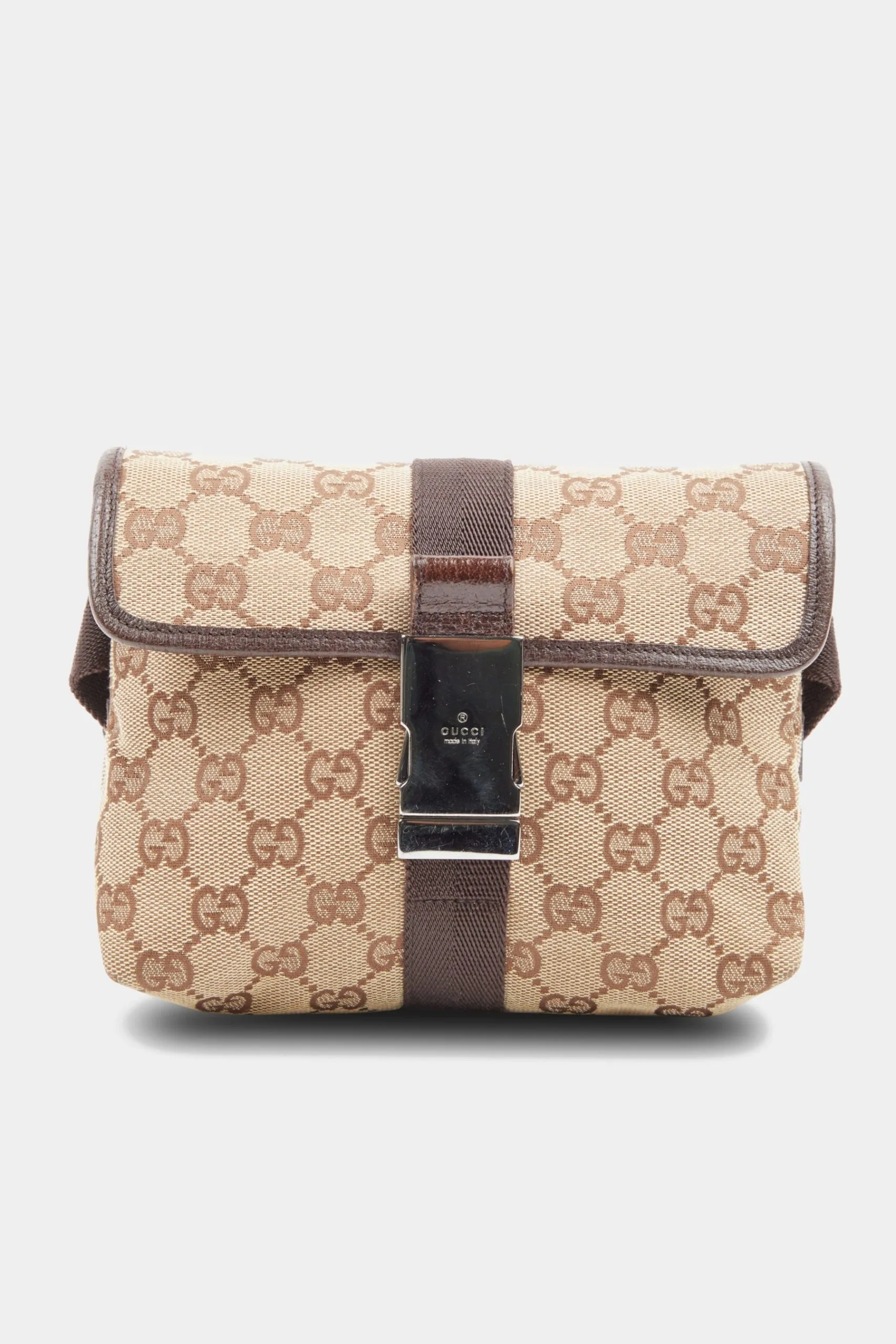 The Waist Bag is a sleek and chic pouch from Gucci, crafted in the coveted GG Canvas print in brown canvas. The Waist Bag is a compact and functional pouch adorned with a front flap with a distinctive cross-over canvas strap with Gucci-engraved clip closure in addition to its adjustable strap that allows it to be worn on your waist, across the body, or on the shoulder, providing hands-free convenience on days when you want to travel light. Unless otherwise stated, the item does not come with original brand accessories.