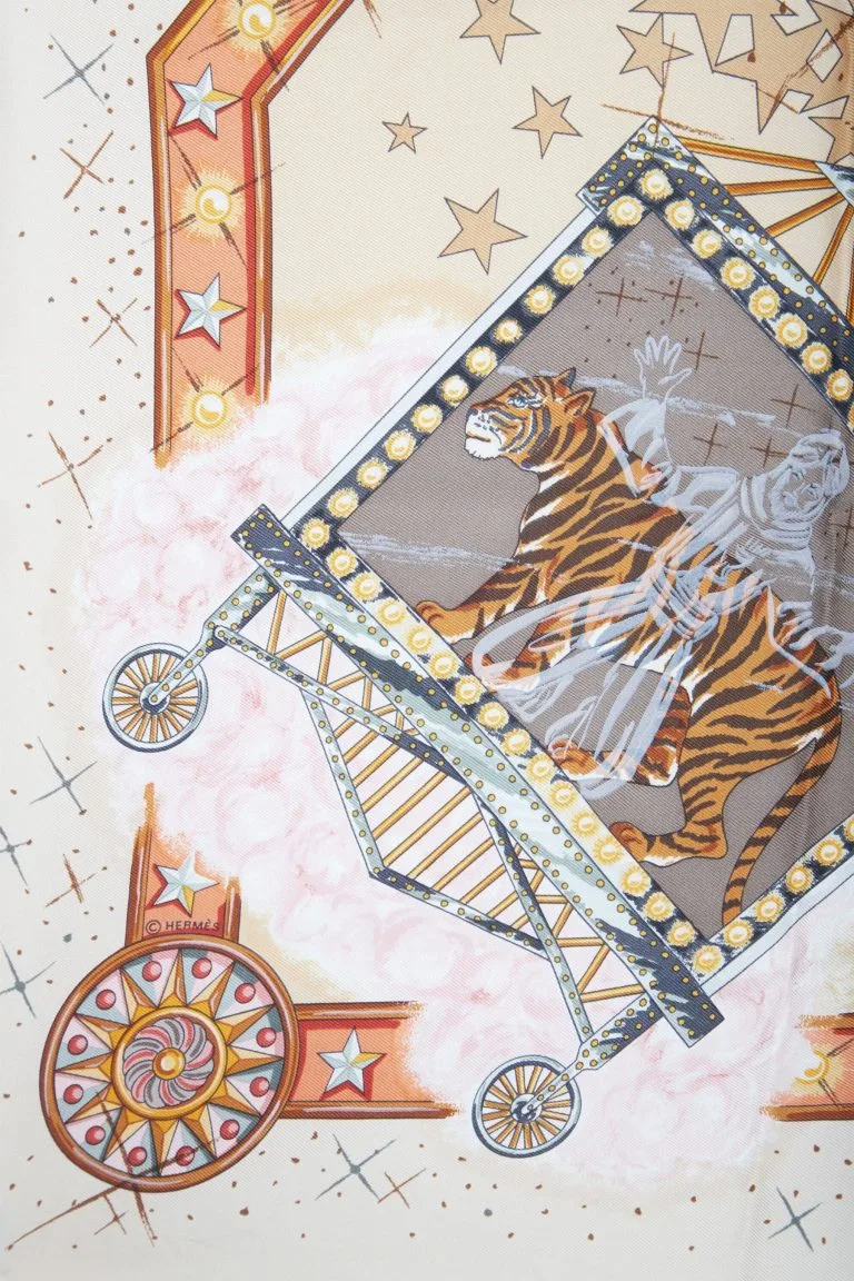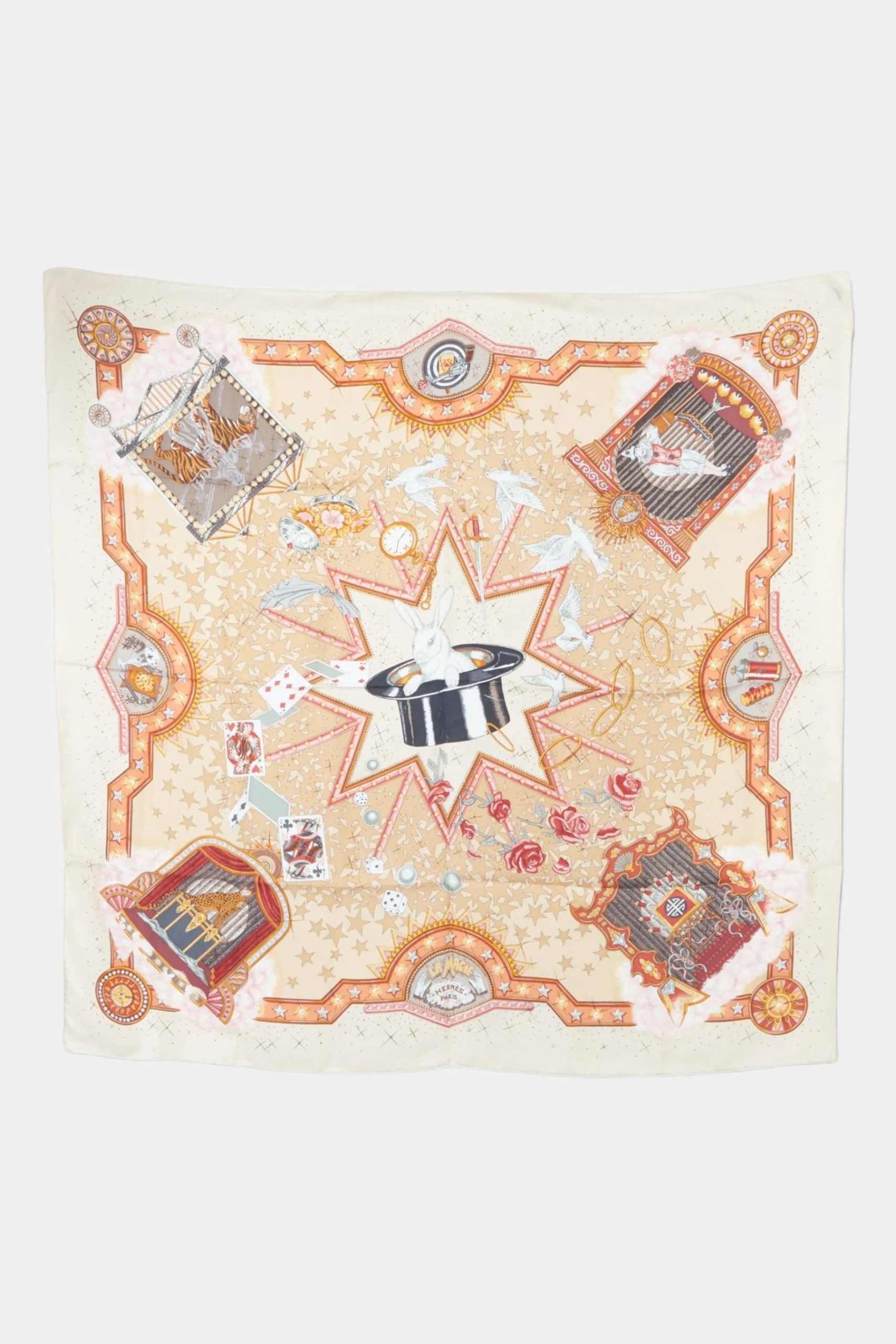The La Magie Scarf is a charming scarf from Hermes, crafted in 100% silk, designed by Claudia Mayr in 1999. It has a magic motif that features whimsical details with a bunny inside a magic hat as its centerpiece, making it a wonderful accessory that can instantly add a touch of elegance to any outfit. Unless stated otherwise, the item does not come with original brand accessories.