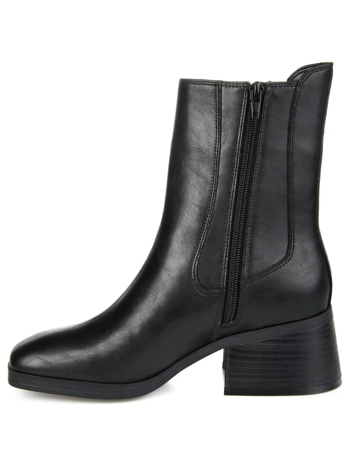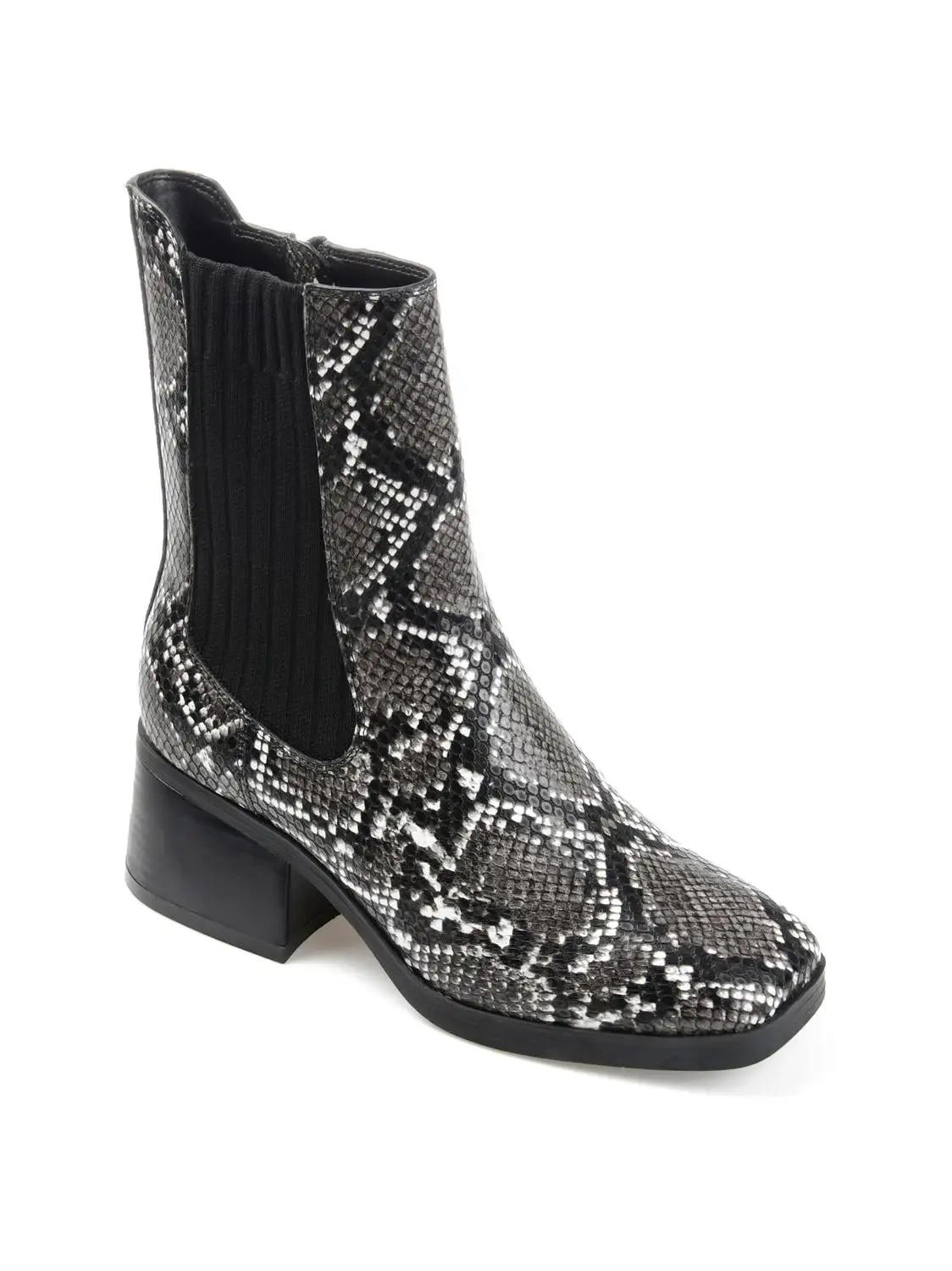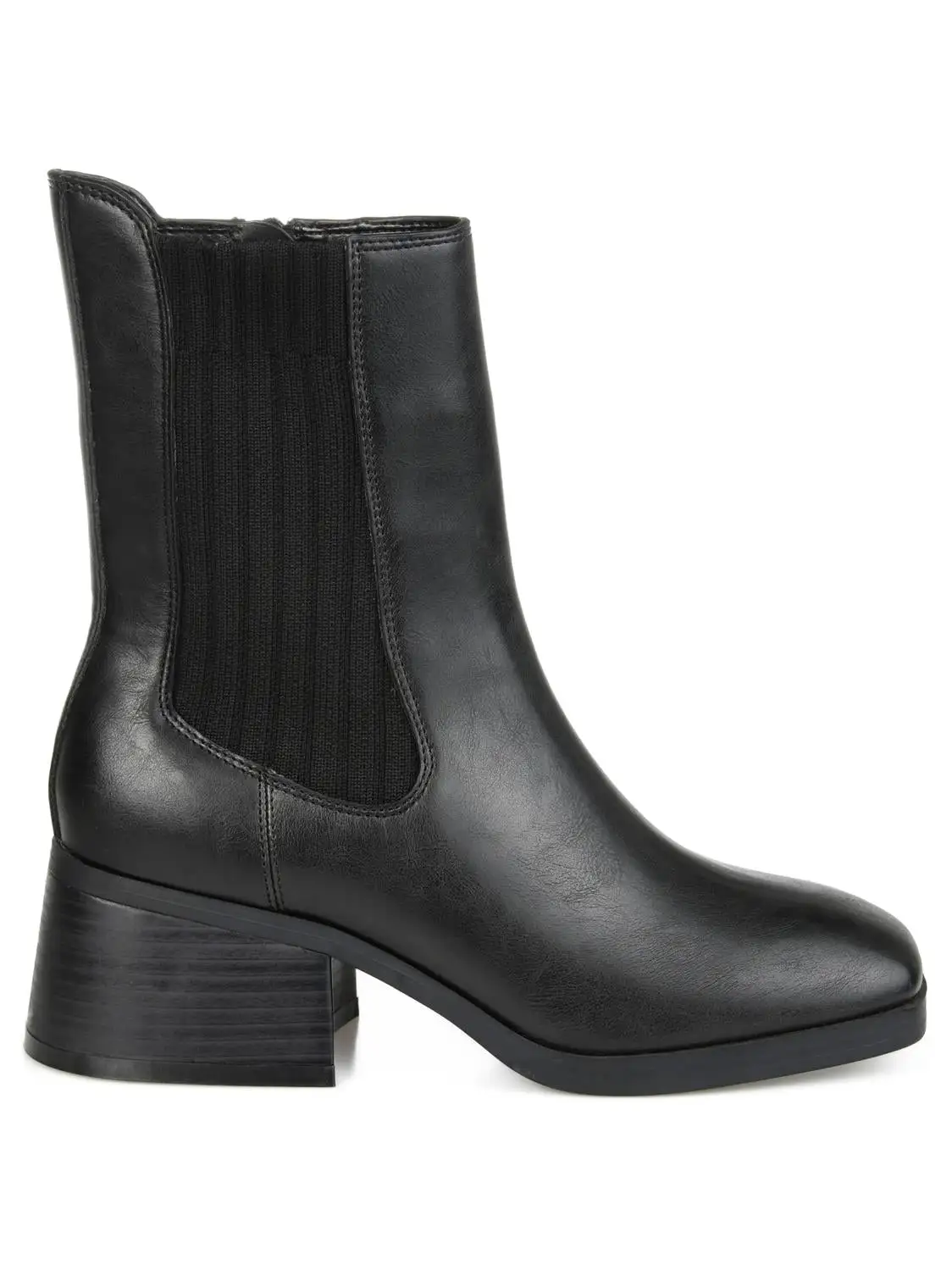 Cool contemporary details define the Desree by Journee Collection. A stretch knit panel and an inside zipper accent this square-toe bootie. A low heel paired with a 4 mm Tru Comfort Foam™ footbed finish this vegan leather silhouette.
