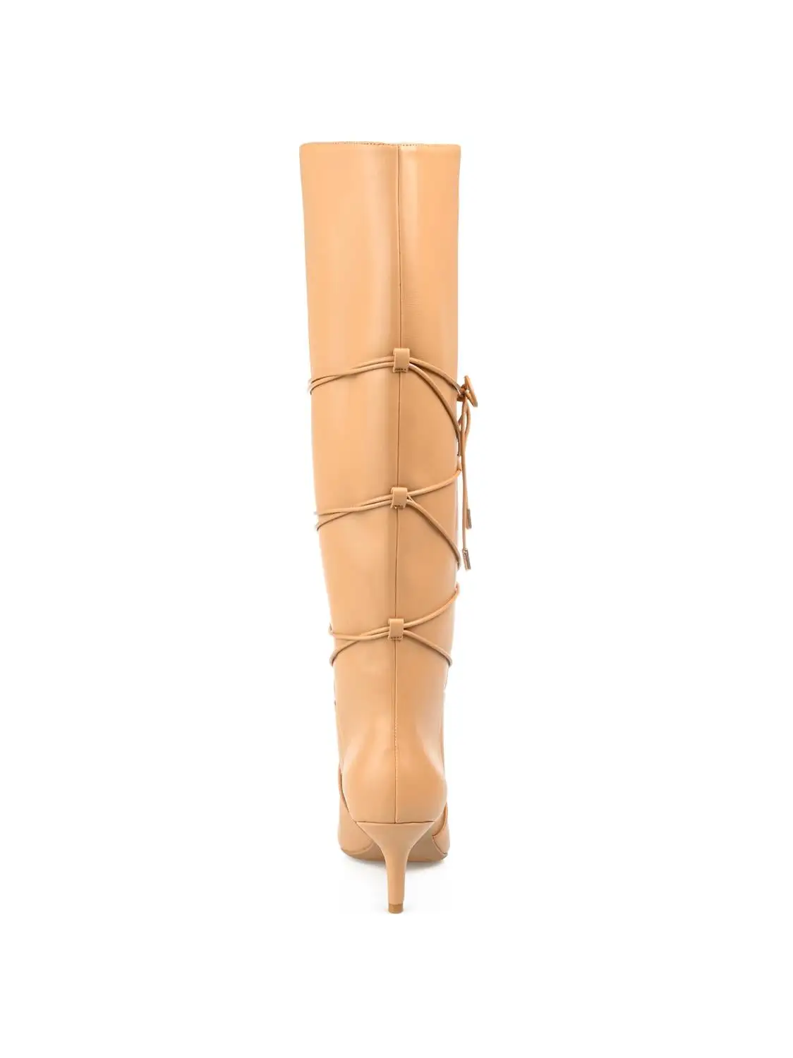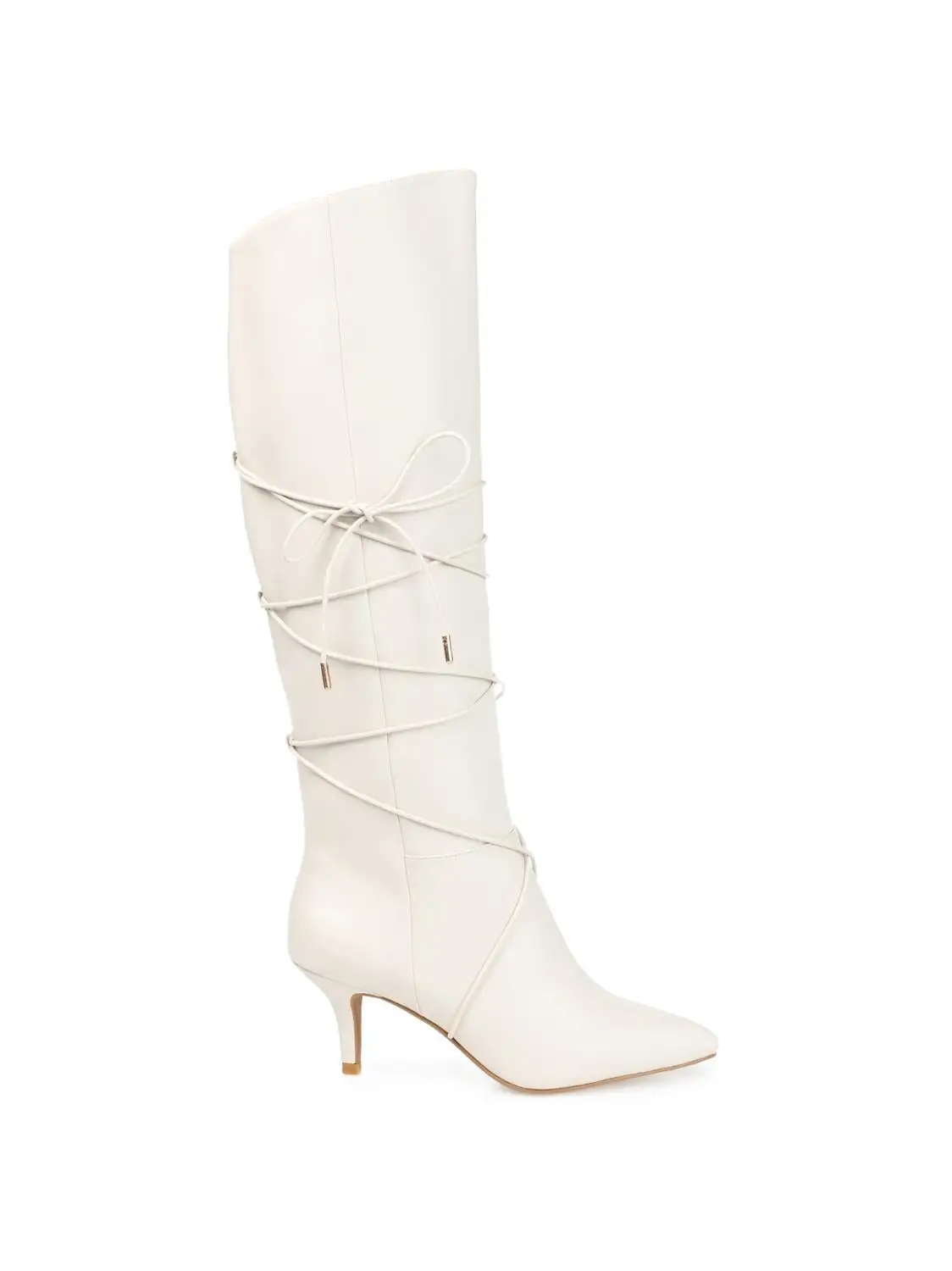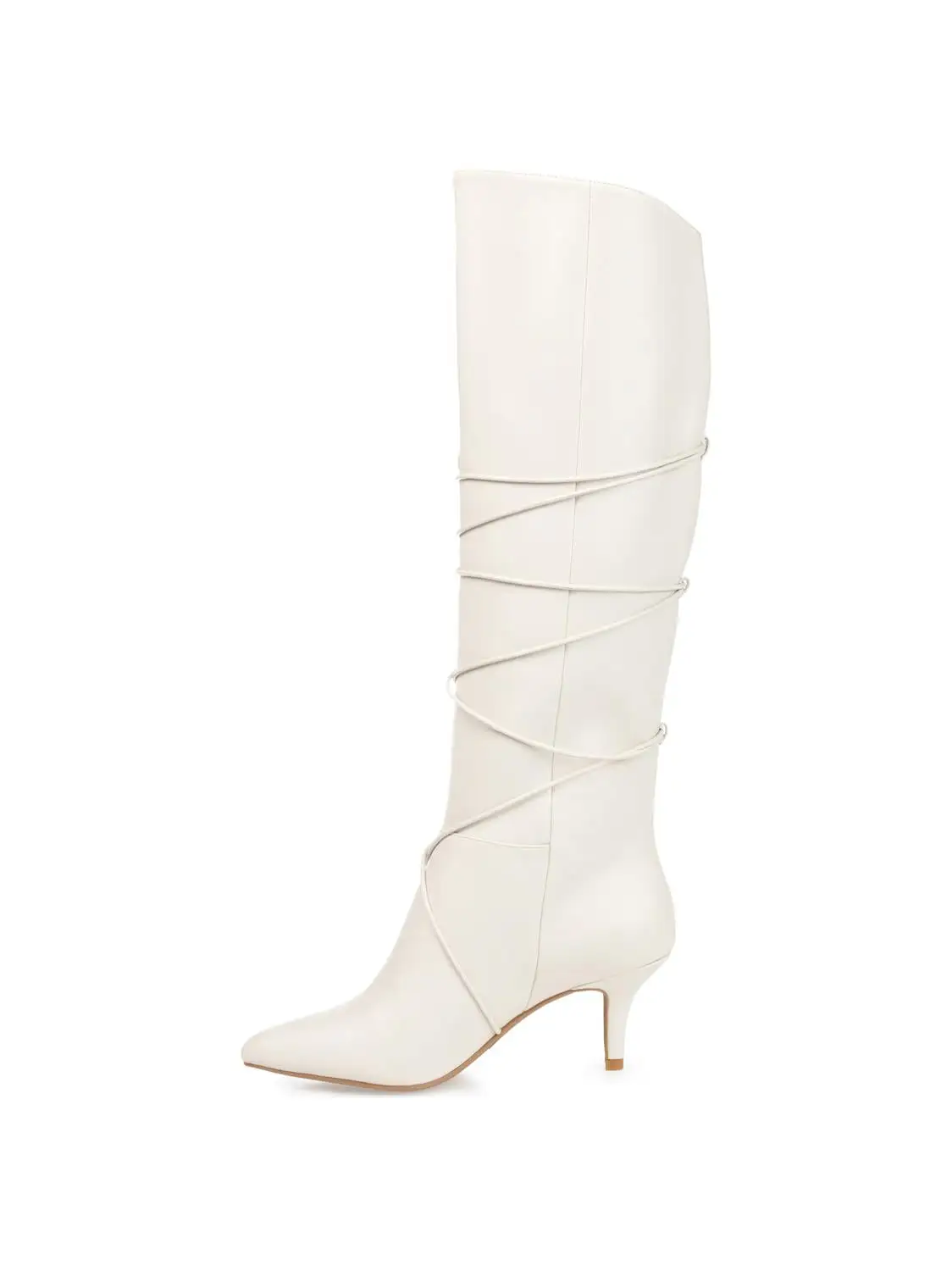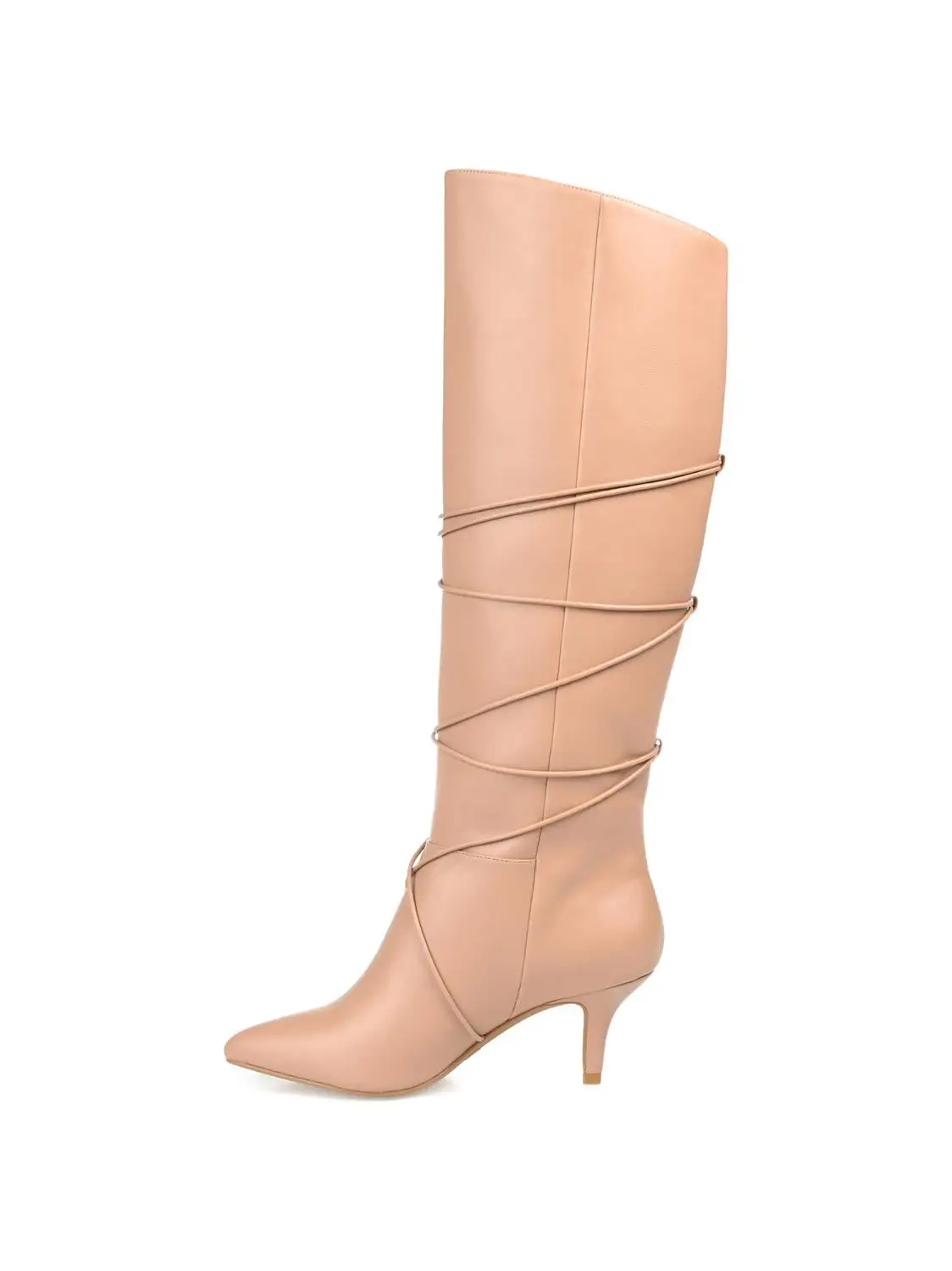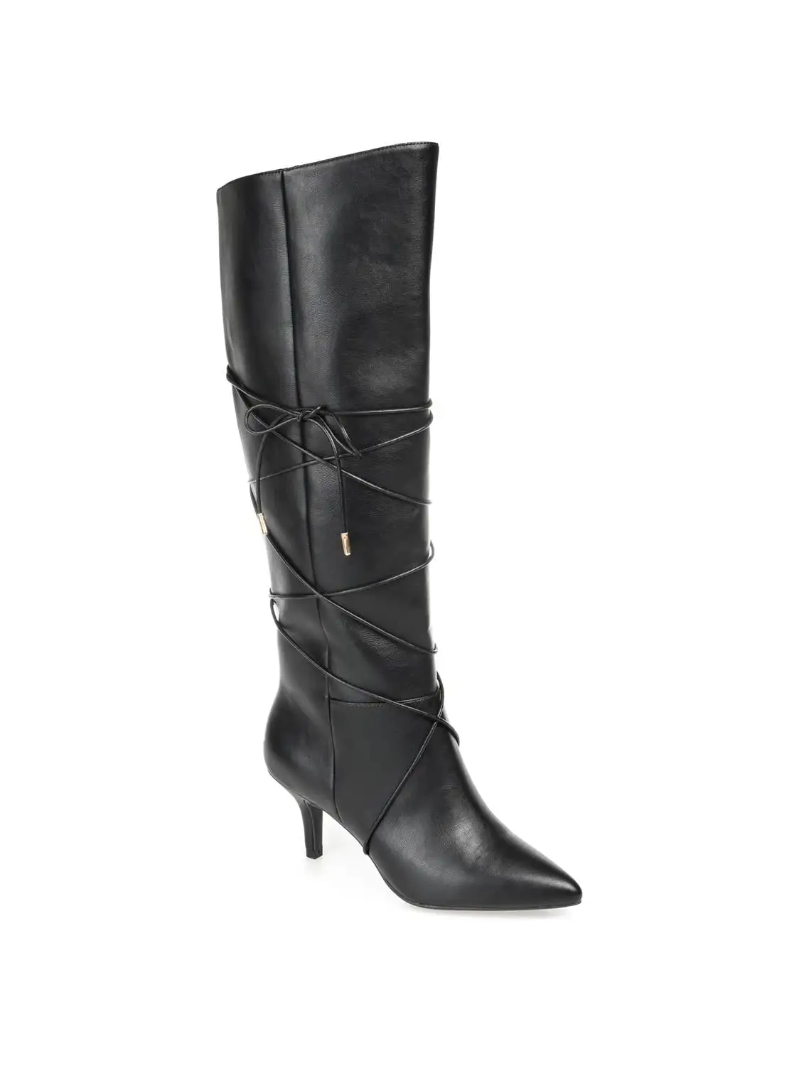 The Kaavia boots by Journee Collection are undeniable proof that kitten heels and pointed-toes have always been a stylish combination. This knee-high boot will add a chic finish to any look with its pointed-toe and wrap-around strap detail. Soft vegan leather and a supportive 4 mm Tru Comfort Foamâ„¢ insole finish this extra-wide calf style.