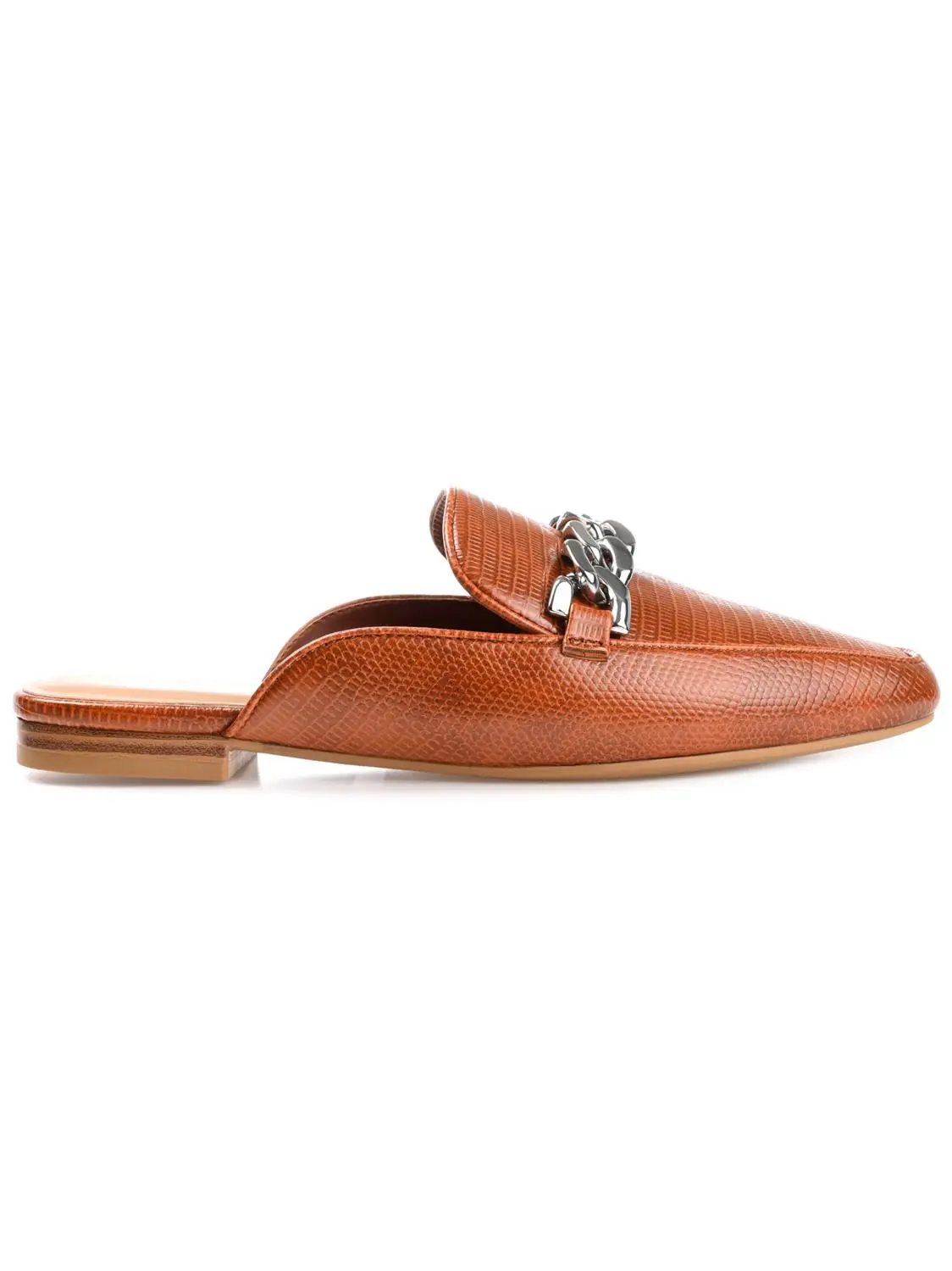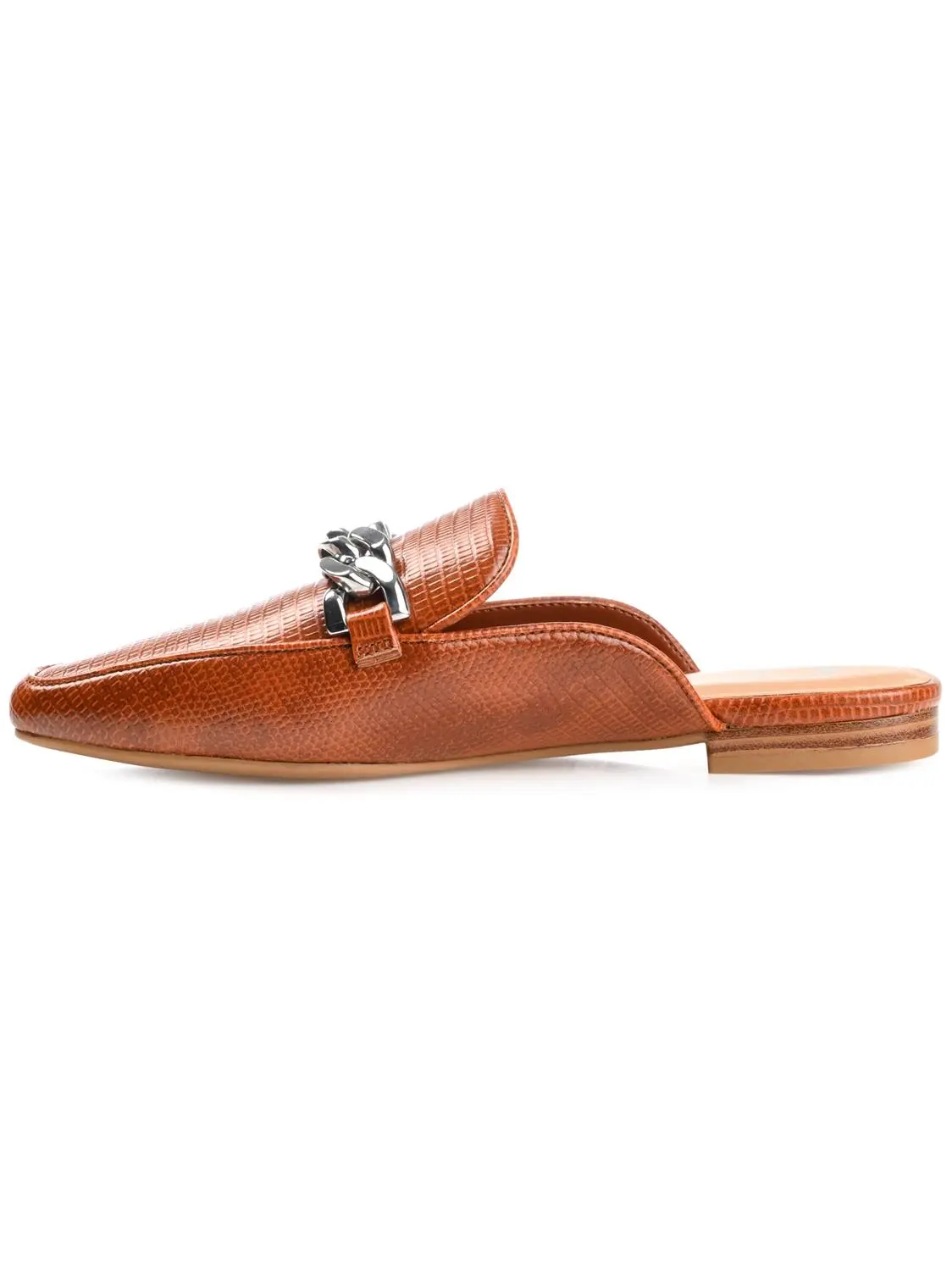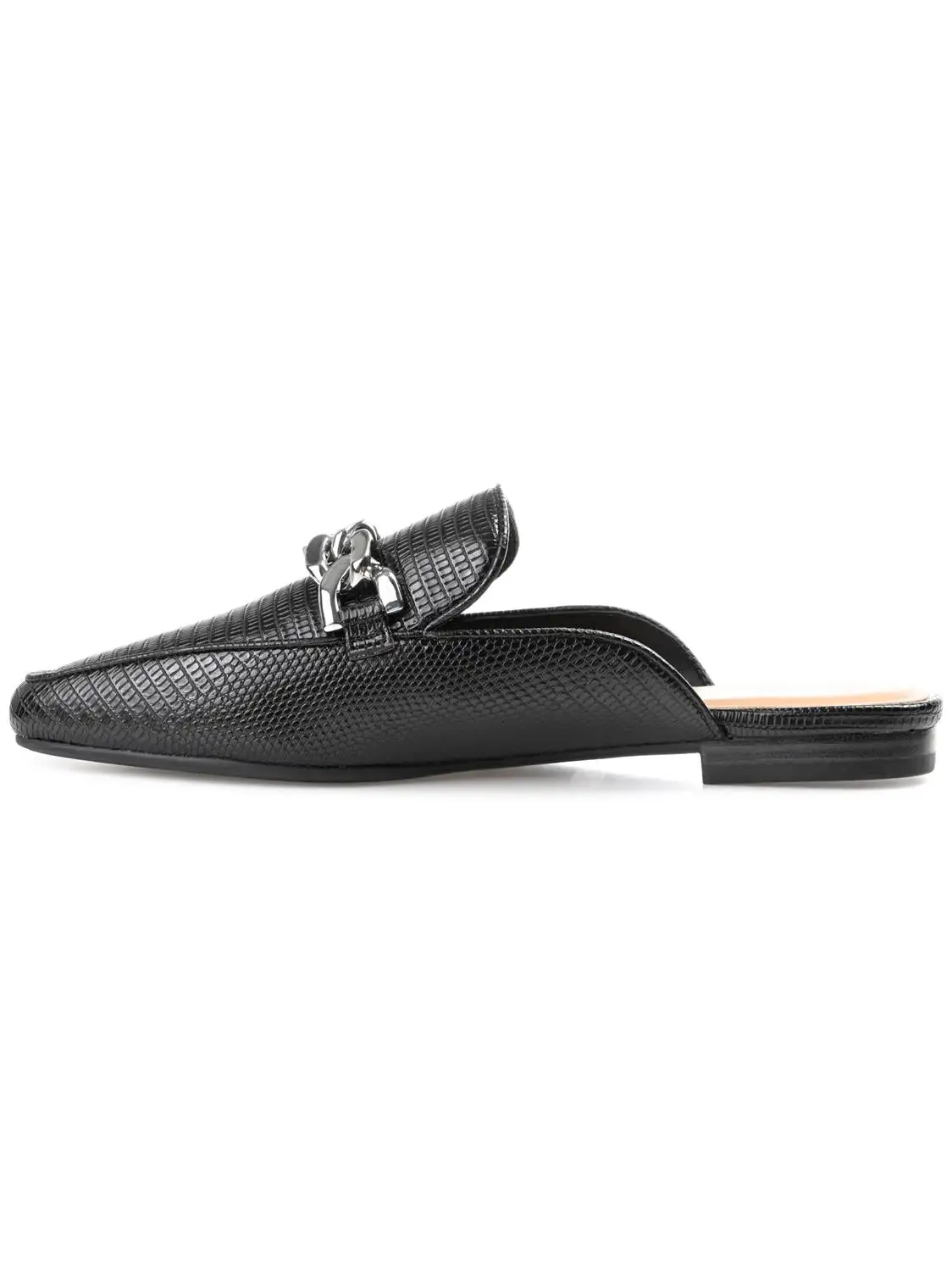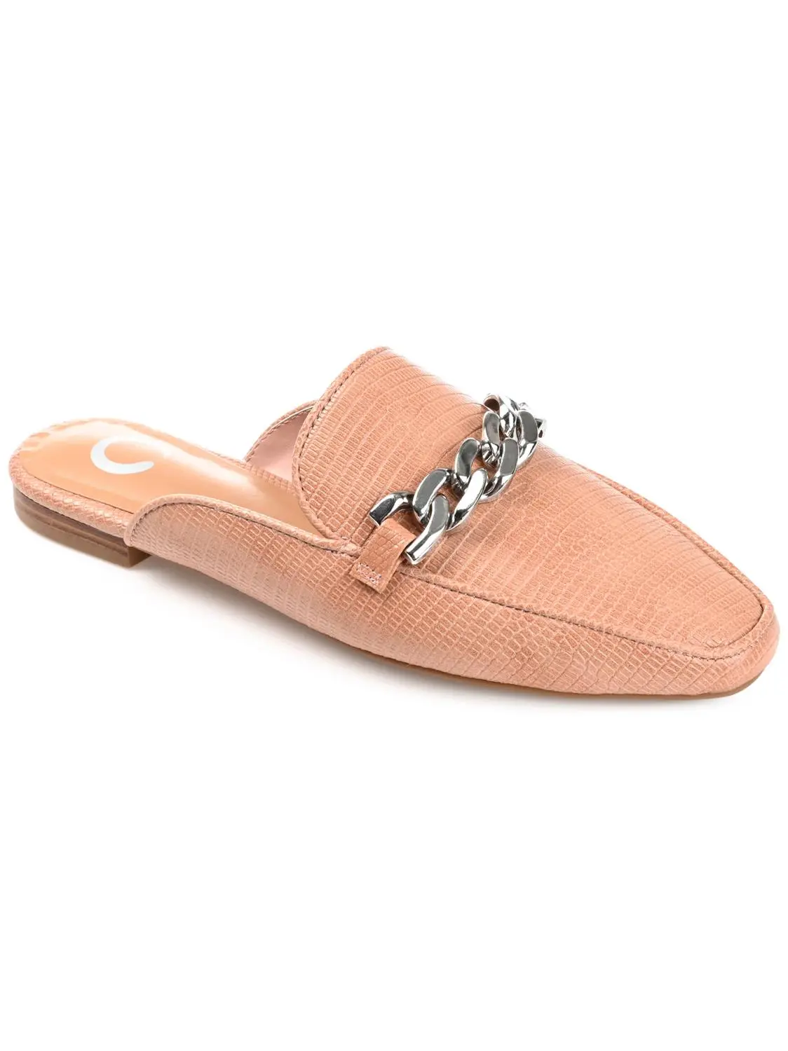 A versatile mule flat that can handle your Monday through Sunday looks, the Hazina by Journee Collection. This square toe mule is embellished with a silver-tone chain accent and a notched topline. Lizard textured vegan leather shapes the silhouette, and a 4 Tru Comfort Foam™ footbed makes them oh-so-comfy.