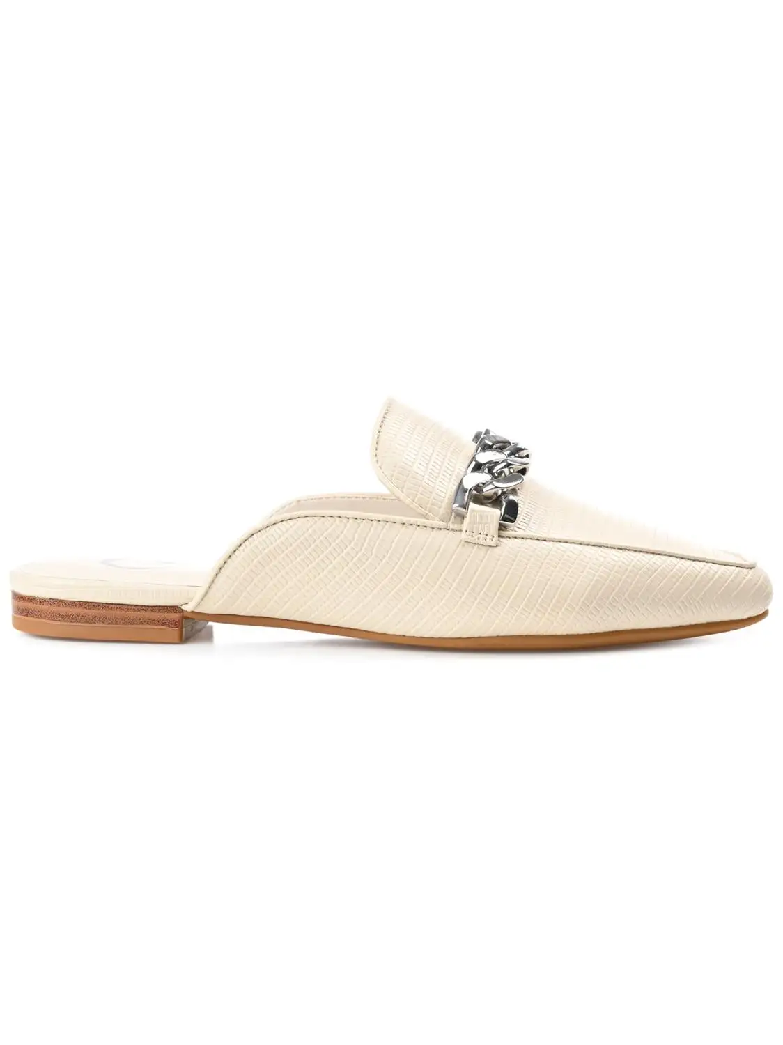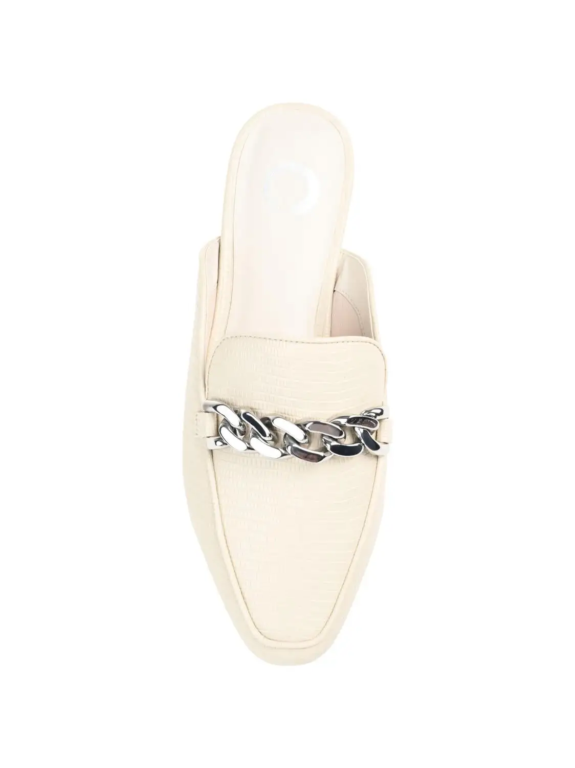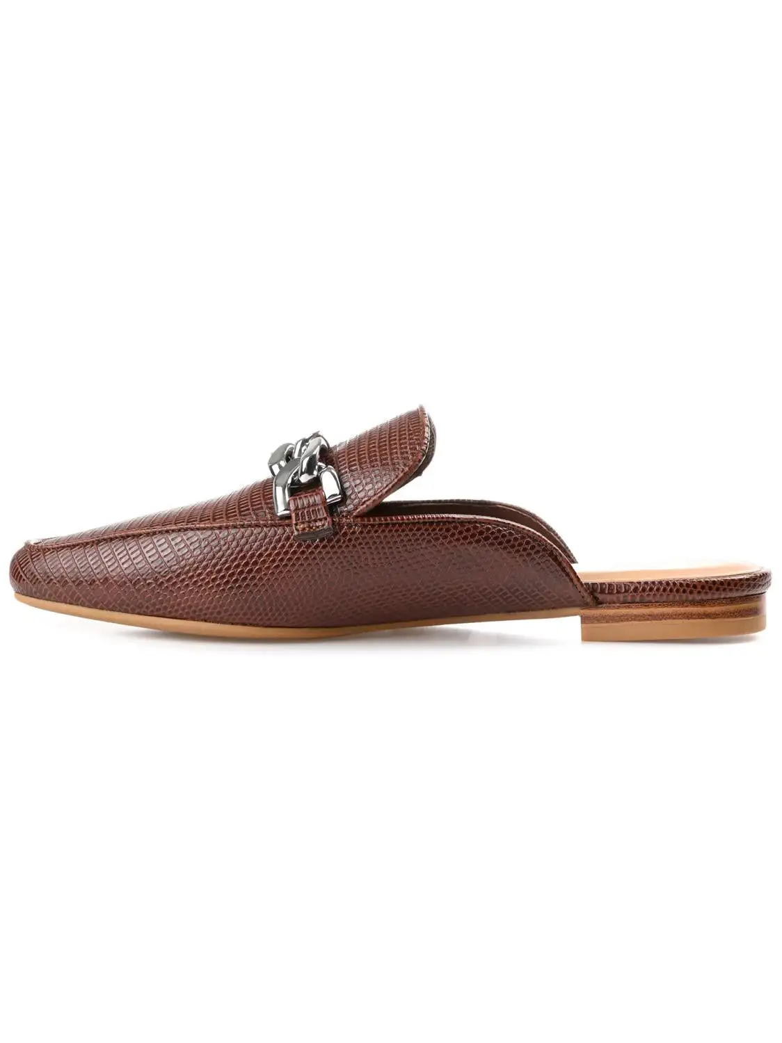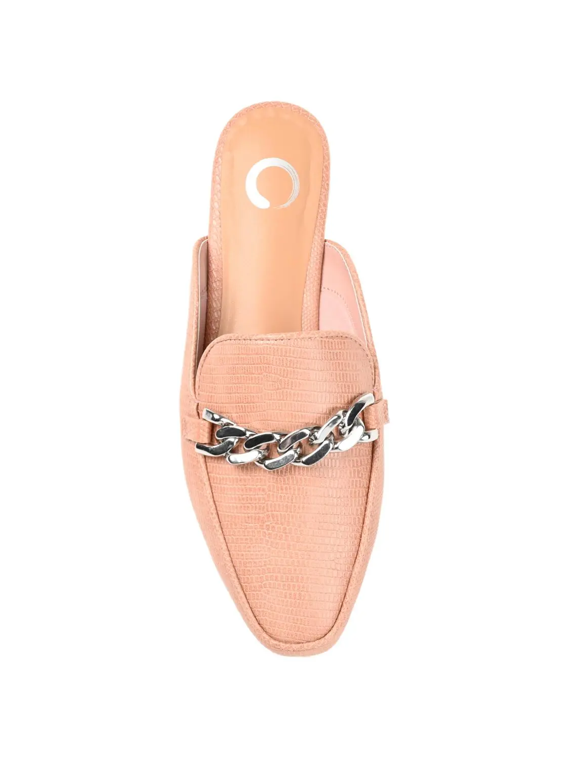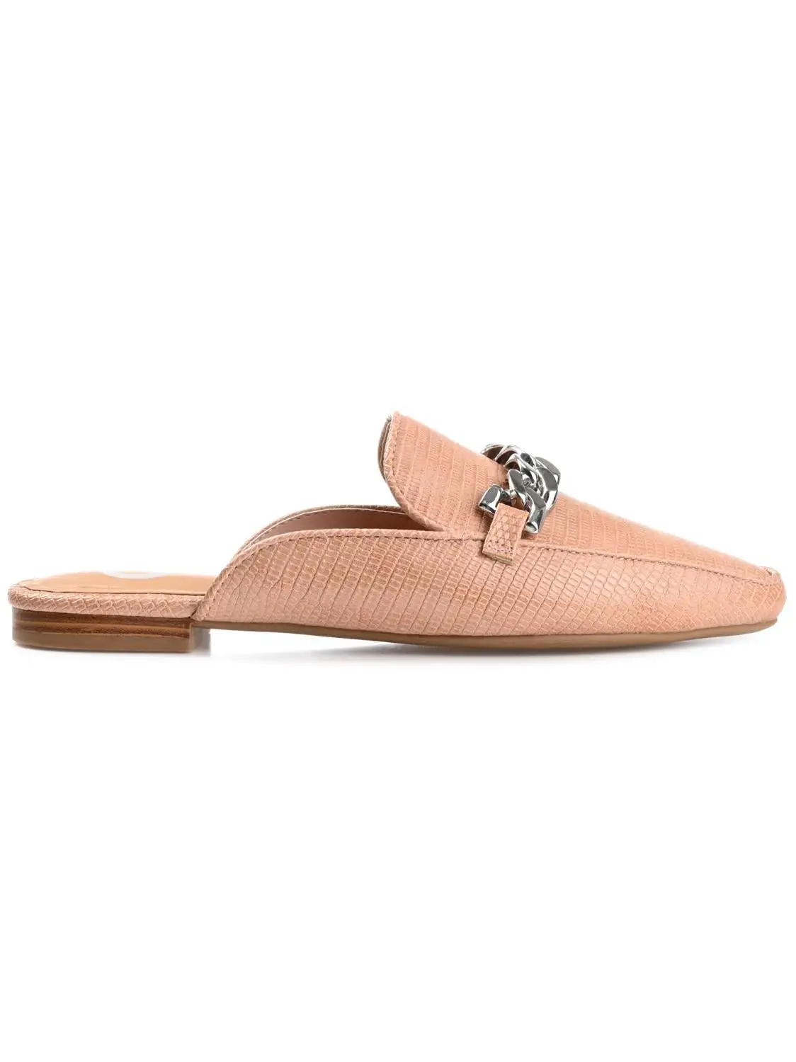 A versatile mule flat that can handle your Monday through Sunday looks, the Hazina by Journee Collection. This square toe mule is embellished with a silver-tone chain accent and a notched topline. Lizard textured vegan leather shapes the silhouette, and a 4 Tru Comfort Foam™ footbed makes them oh-so-comfy.