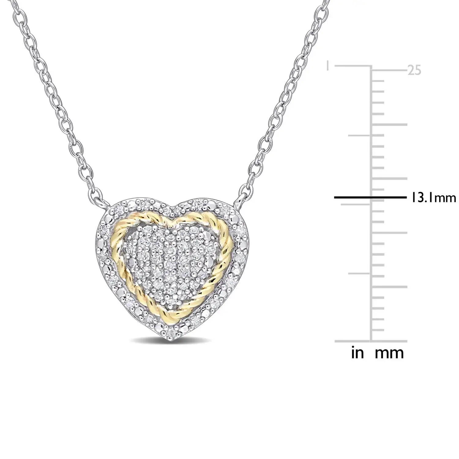 This dazzling cluster halo heart necklace is crafted in two-tone white and yellow plated sterling silver. This lovely halo pendant features round-cut, pave-set diamonds clustered together in a heart motif. Enhanced with a high polish finish, this pretty necklace is suspended on a 17-inch cable chain and is secured with a spring ring clasp. Pair this trendsetting and timeless necklace with any ensemble and look stunning. A perfect addition to any jewelry collection.