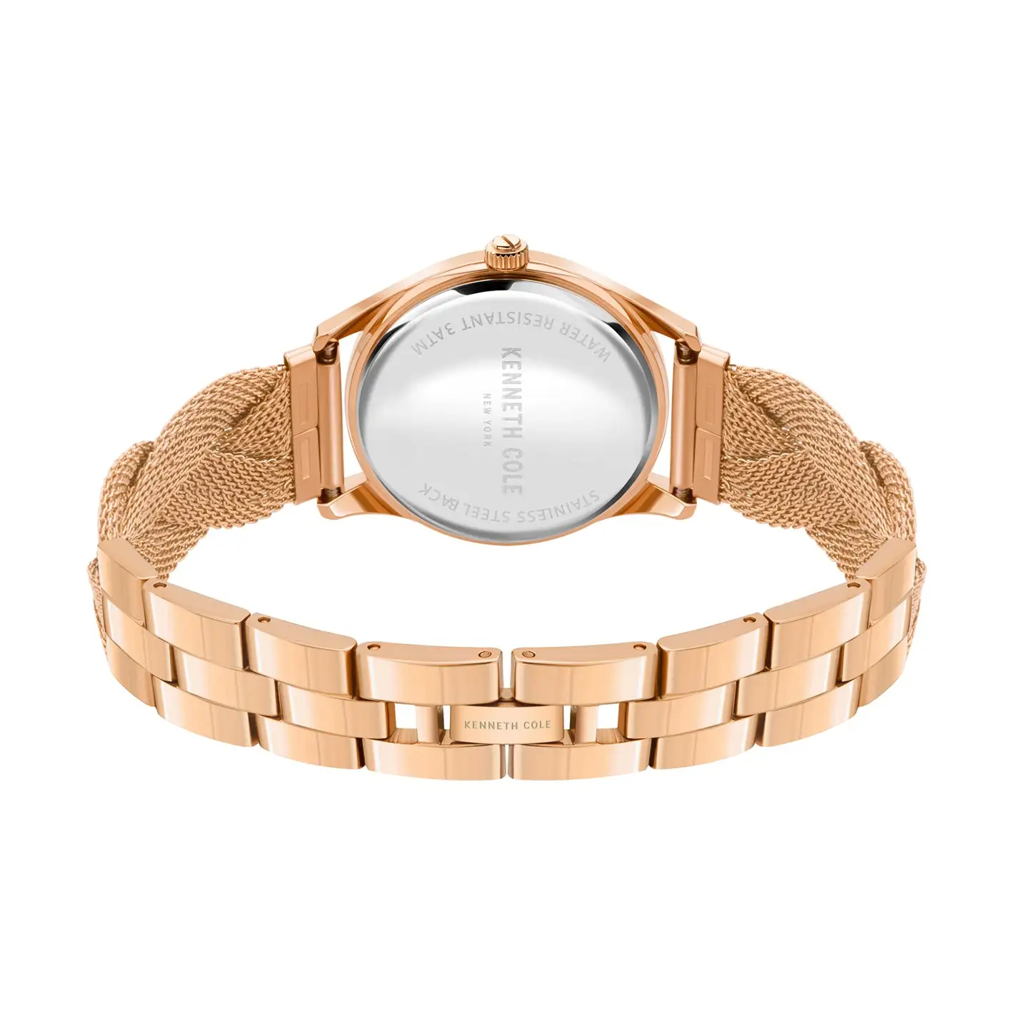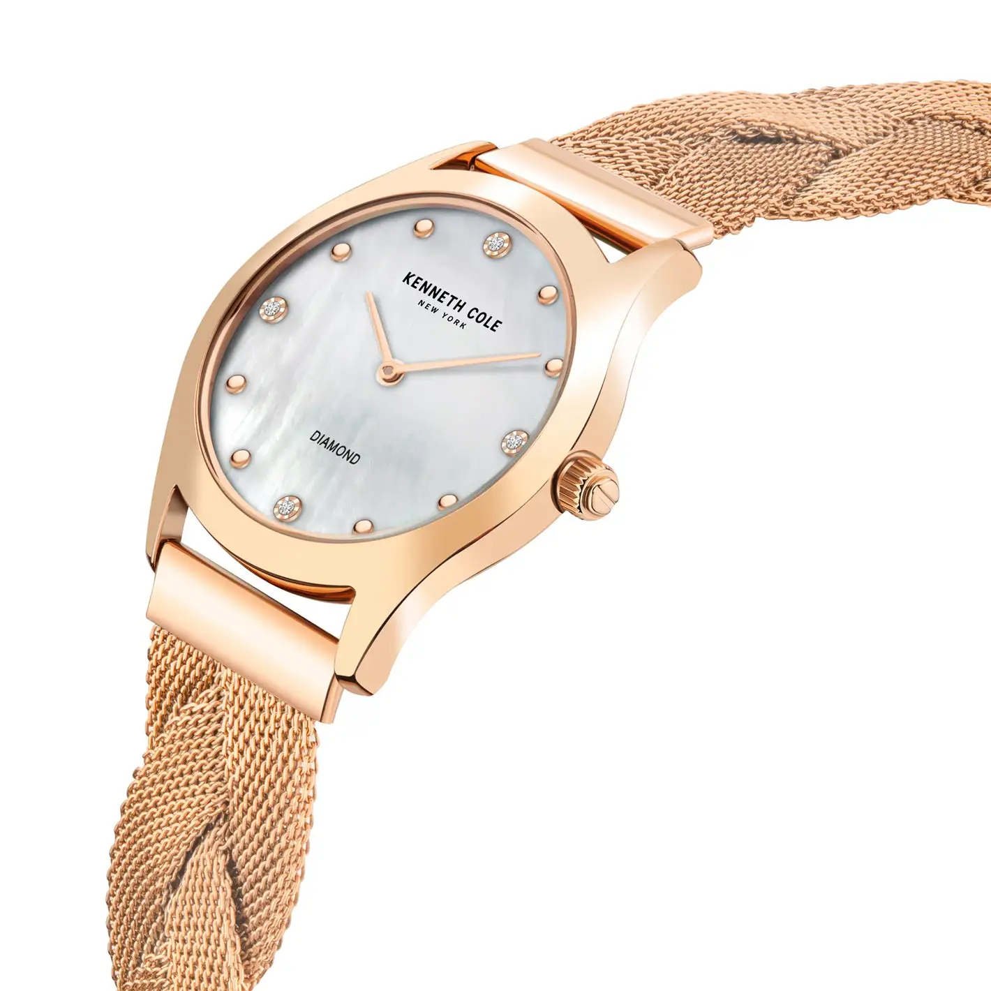 Kenneth Cole New York ladies classic dress watch features a 34mm rose gold round case. The mother of pearl dial is accented with dot and crystal stone hour markers. The watch is complimented with a rose gold mesh braided detailed strap.