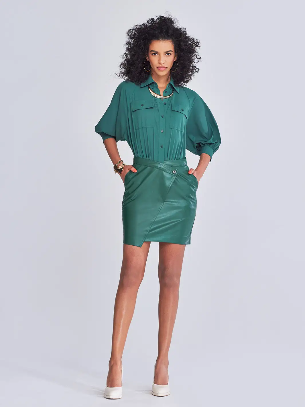 This style takes the quintessential shirt dress for an edgy spin, rendered in faux-leather with a flattering cinched waist.