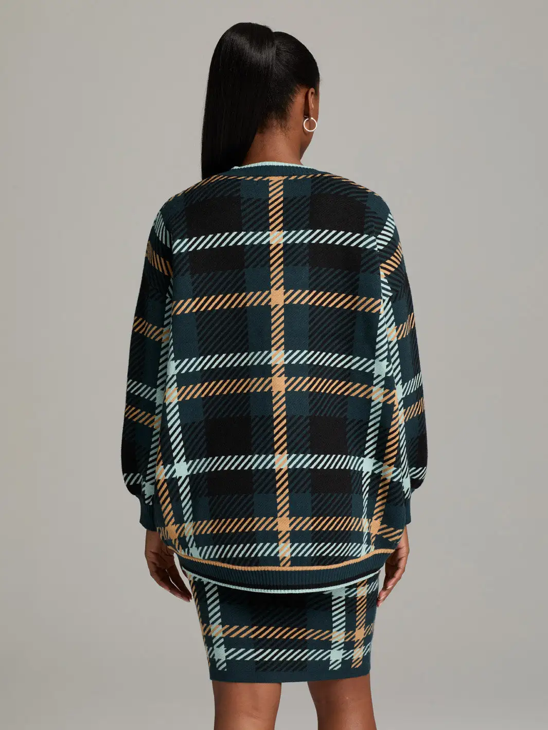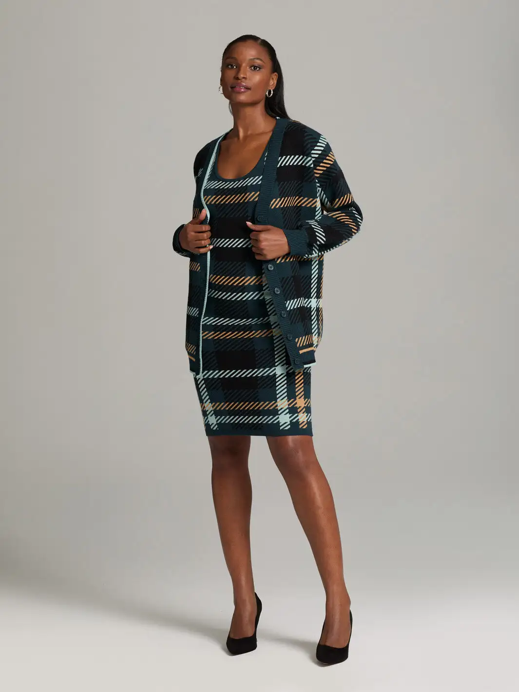 A must-have for every fall closet, this tunic cardigan is knitted in a classic plaid pattern with buttons down the front. Leave it open over a shift dress and booties.