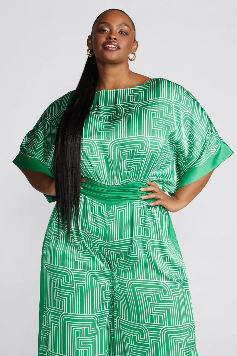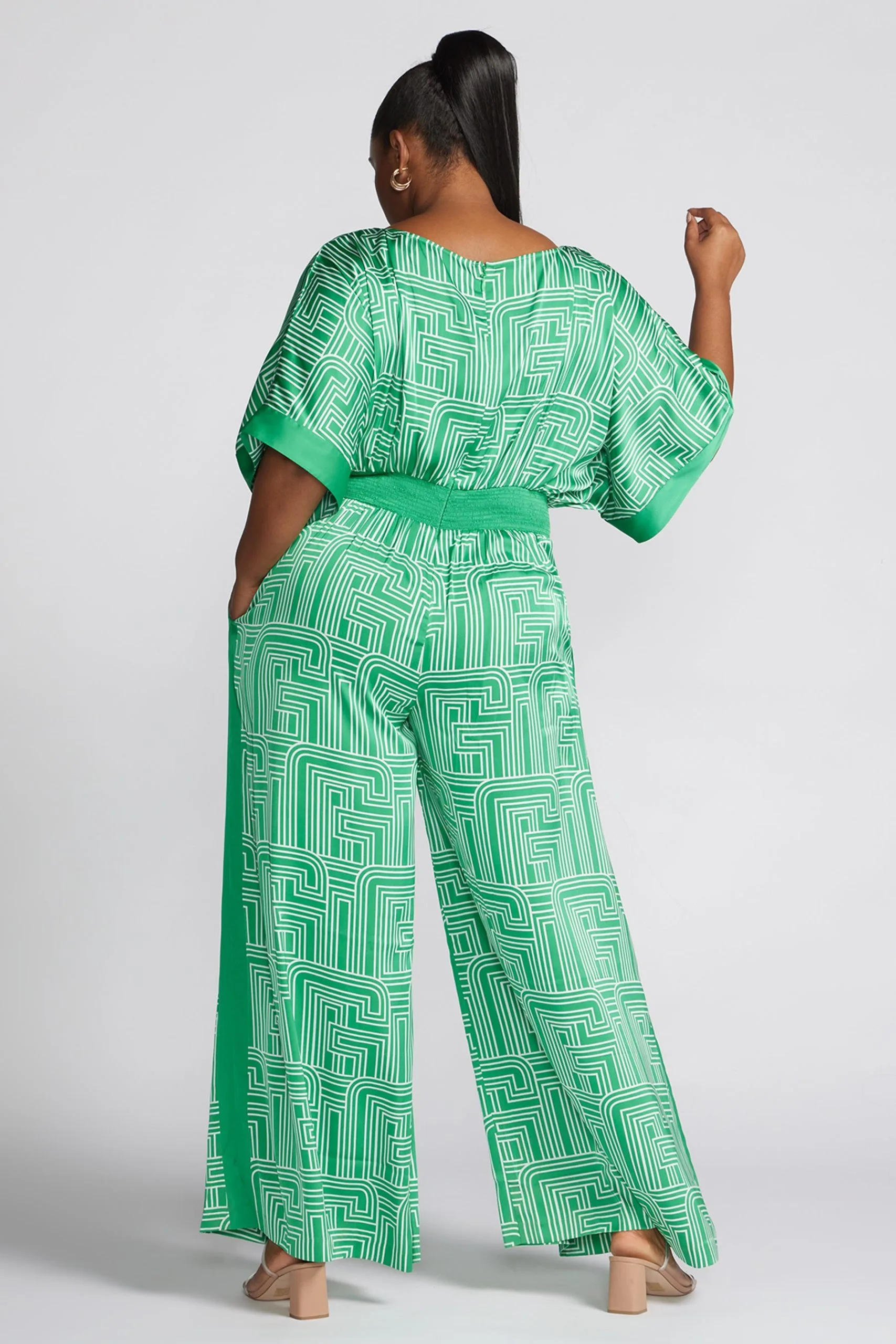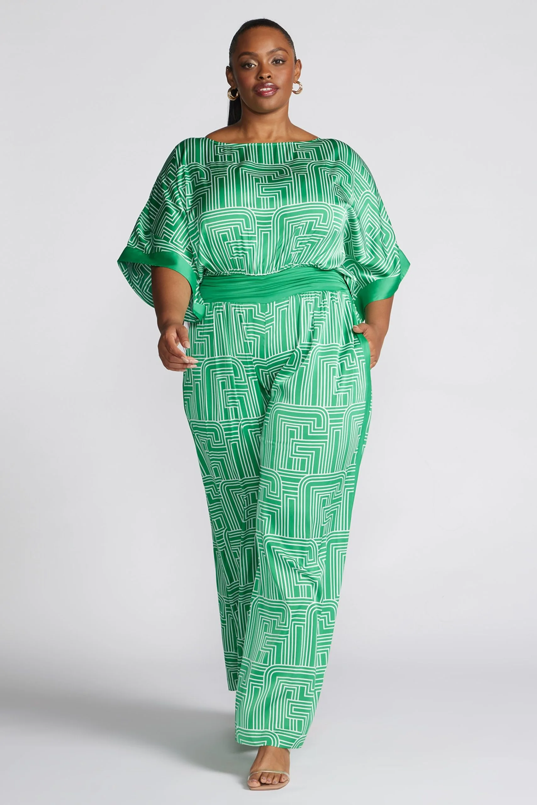 Designed in a cool, geometric print that has outlines of the letter G, this jumpsuit is chic and sleek. It features draped sleeves and a wide leg for an eye-catching silhouette.