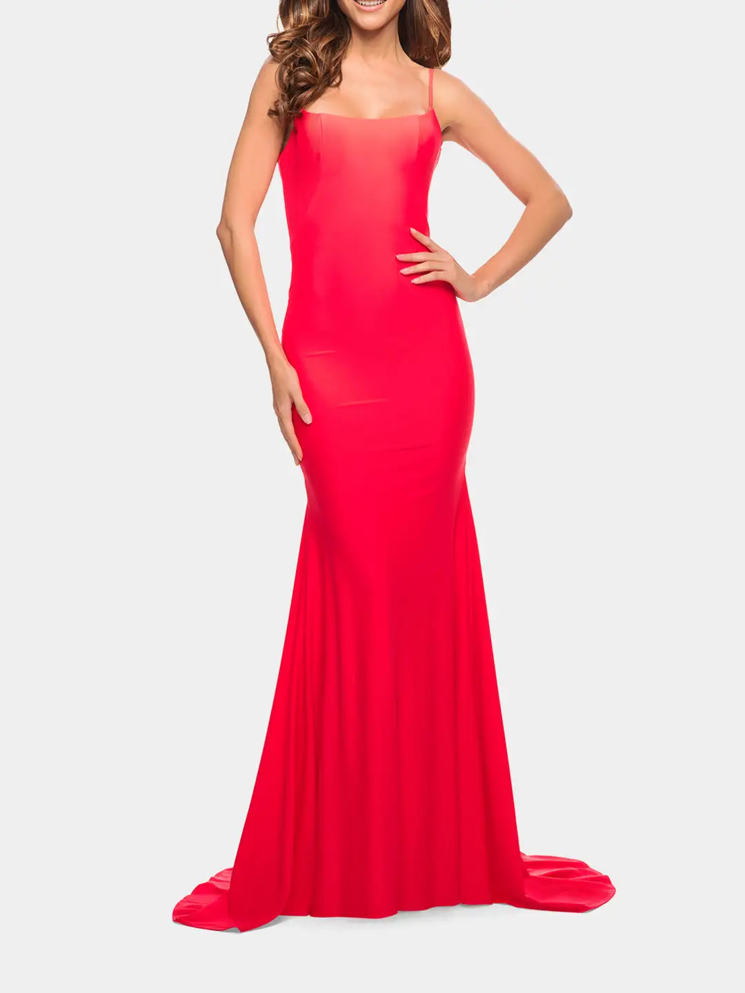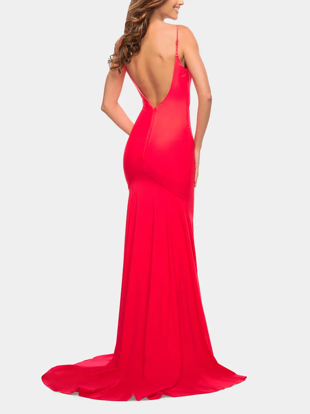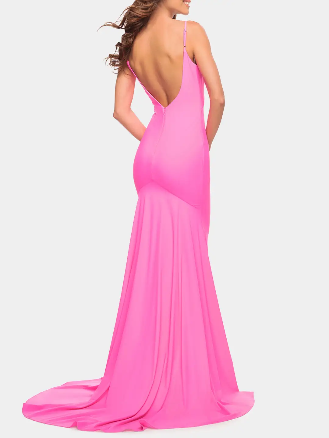 Stunning chic luxe jersey gown with a pretty train that really adds to the princess factor. Low V back. Back zipper closure for easy dressing.