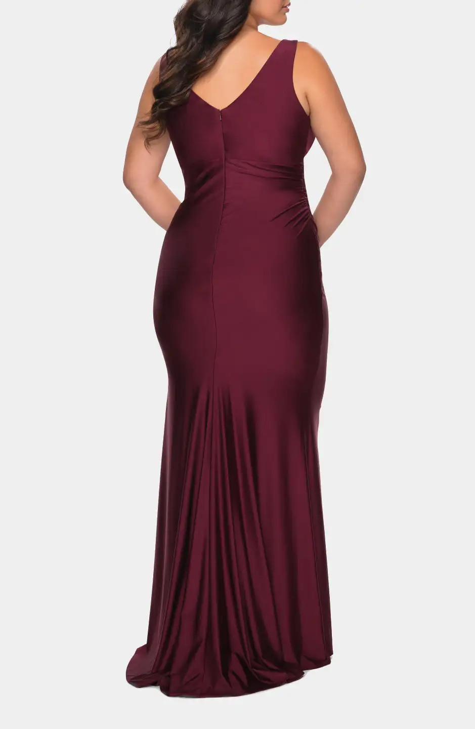 Simple long jersey dress for sizes. Features a faux wrap bodice and flattering plunging neckline. Back zipper closure.