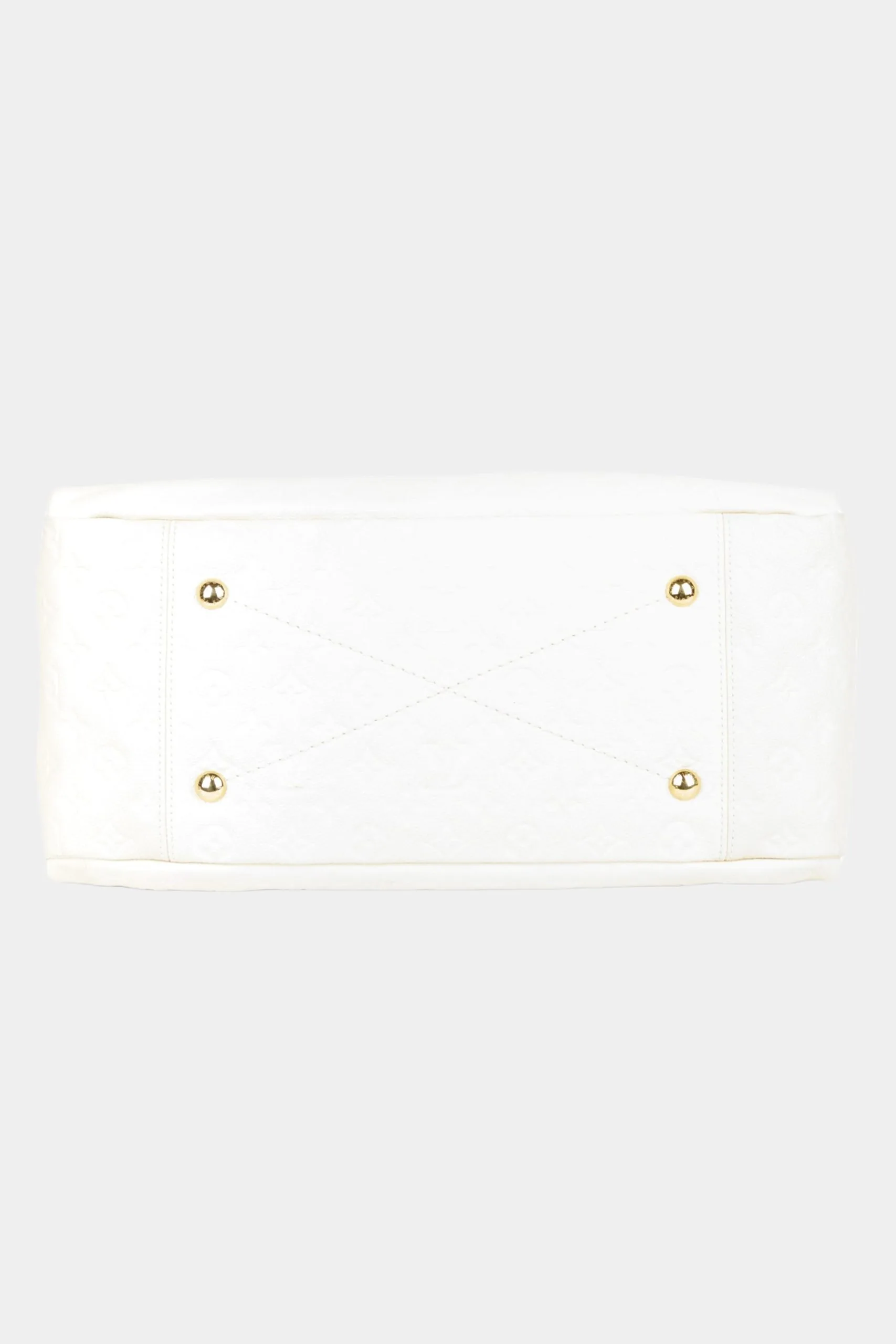 This Artsy GM Shoulder Bag is an avant-garde shoulder bag from Louis Vuitton, crafted in the coveted Monogram print embossed on the top-quality calfskin empreinte leather in white. This bag instantly adds a touch of luxury to any outfit thanks to its detachable rich golden-colored Louis Vuitton key ring and exquisitely handcrafted leather handle in addition to its generous interior that comfortably fits everything you need. Unless otherwise stated, the item does not come with original brand accessories.