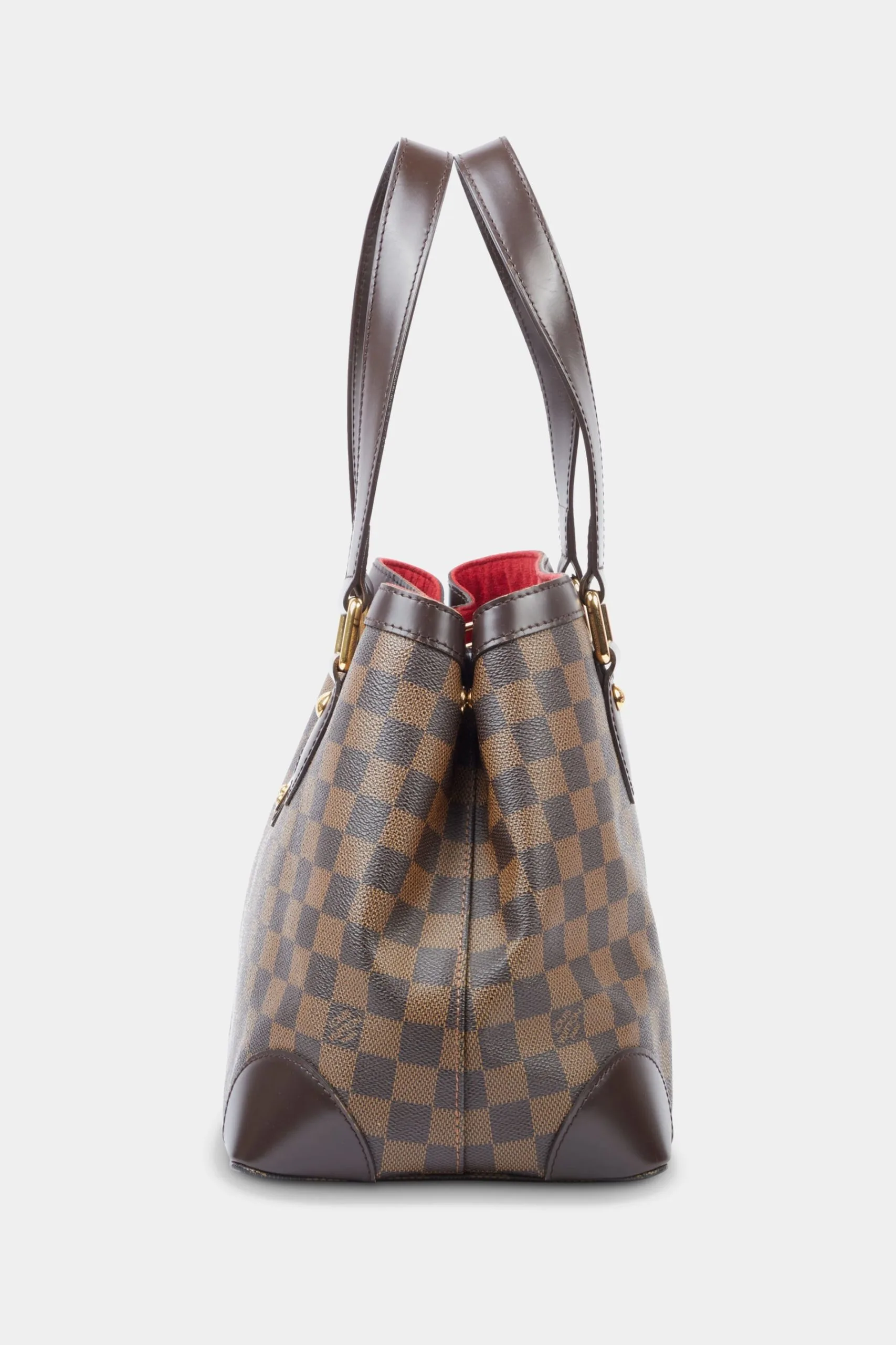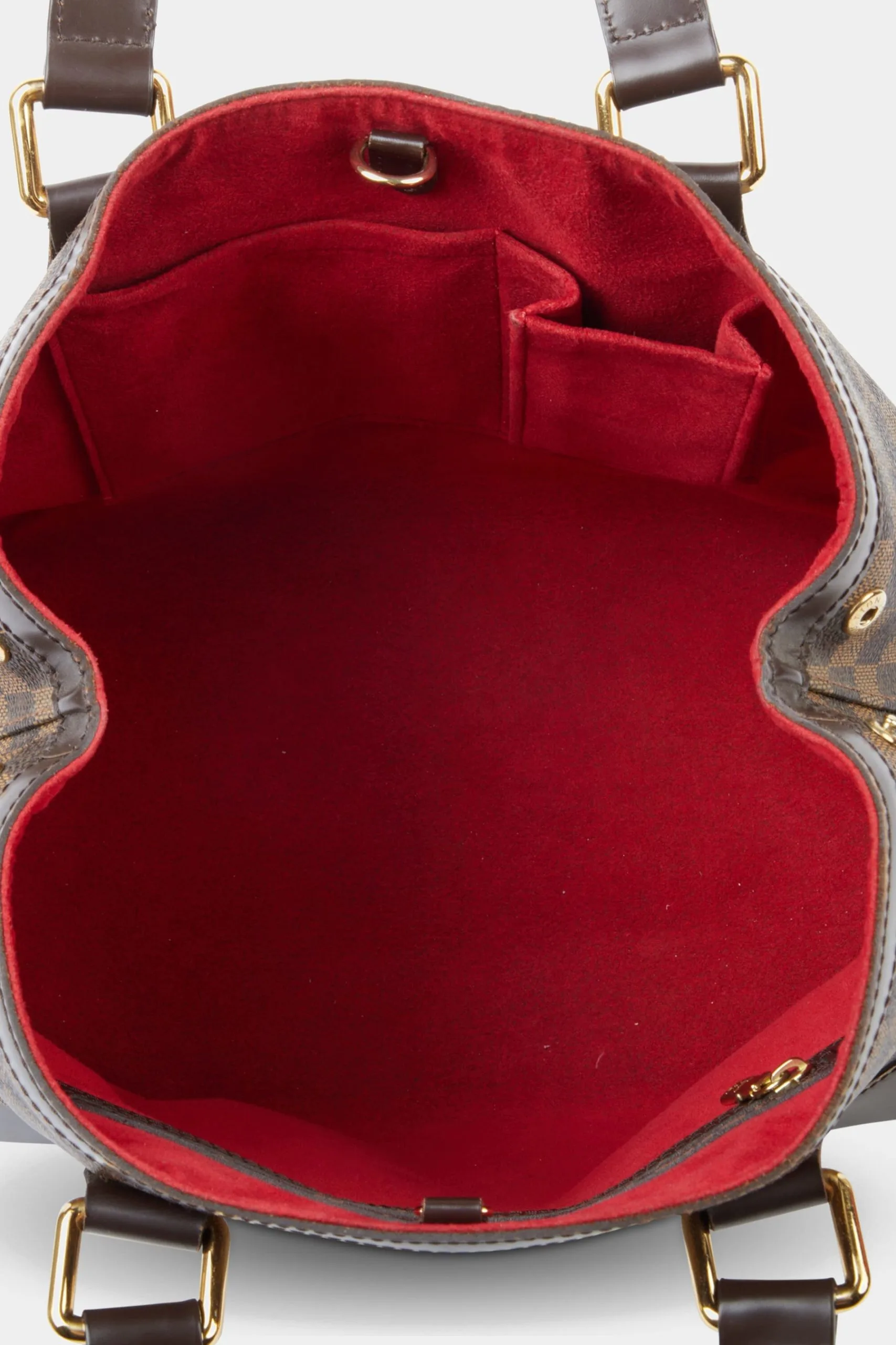Level up your closet with the luxe touch of designer handbags and accessories. The Hampstead PM is a gorgeous open-top tote bag from Louis Vuitton, crafted in the classic brown checkered Damier Ebene canvas. The Hampstead PM, named after a London suburb, is quite roomy with expandable sides that can easily carry your essentials and is adorned with a hard-to-miss golden “Louis Vuitton Inventeur” plaque on the front of the bag.