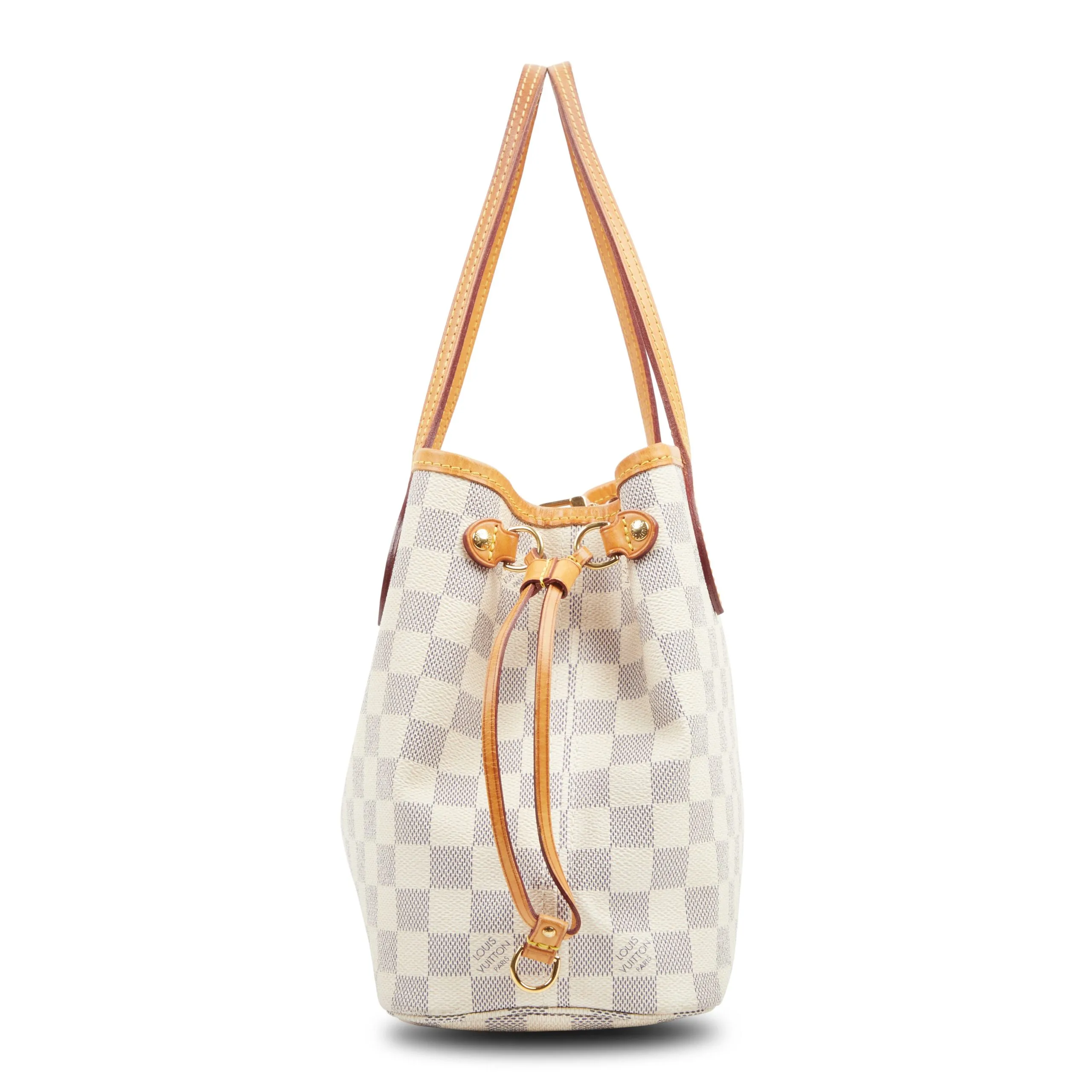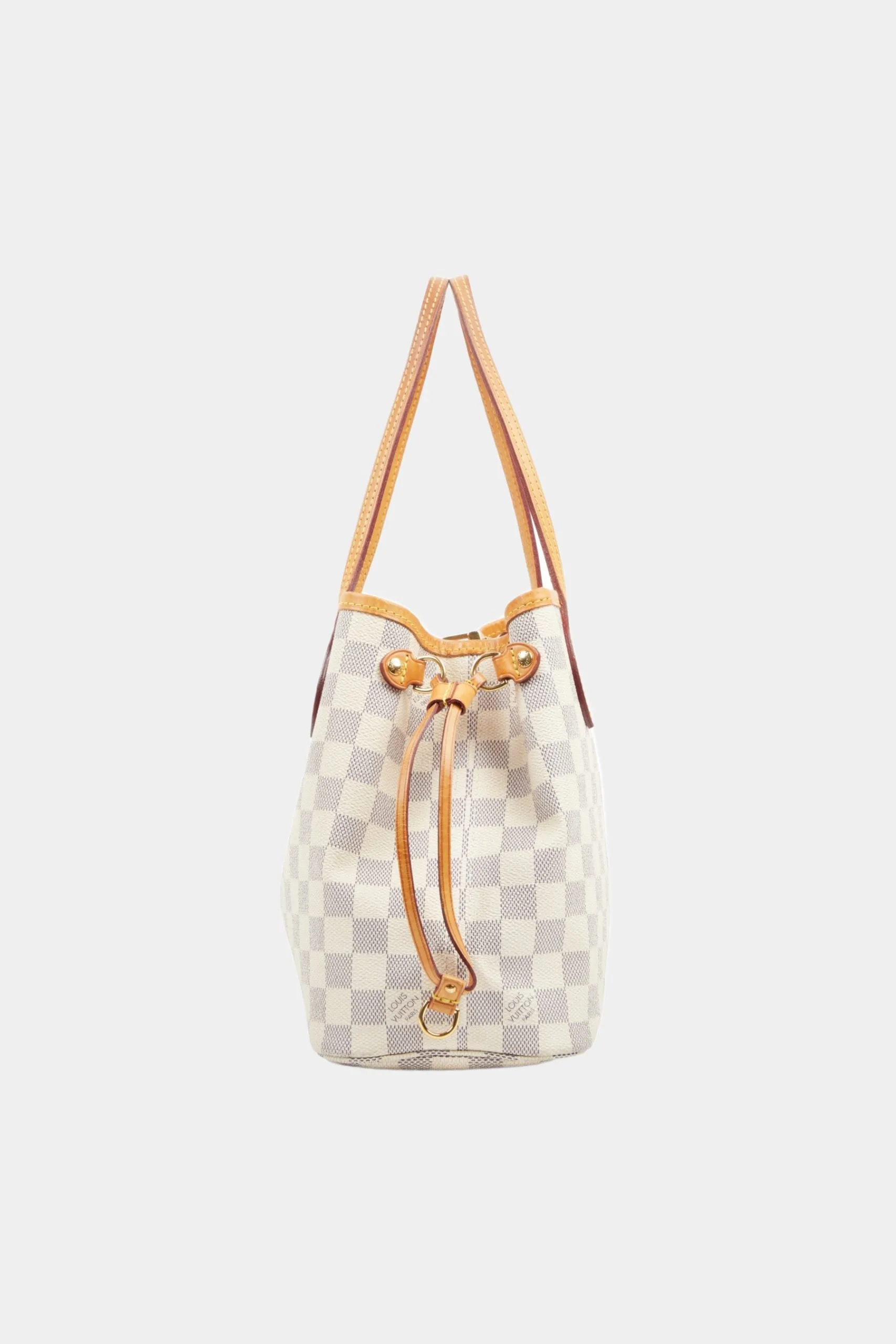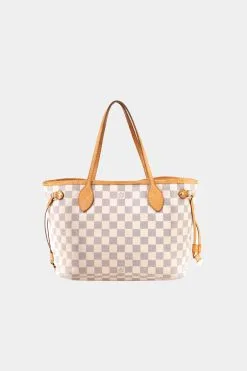 The Neverfull PM is a timeless tote bag from Louis Vuitton, crafted in Damier Azur coated canvas, which is a fresh spin on the iconic Damier Canvas. It is a versatile tote bag that works with a variety of outfits, from casual and business to dressy thanks to its roomy interior yet slim style, natural cowhide leather top shoulder handles and trims, polished brass hardware, and side cinch cords with red detailing that highlight its special accents of luxury and aesthetic. Unless otherwise stated, the item does not come with original brand accessories.