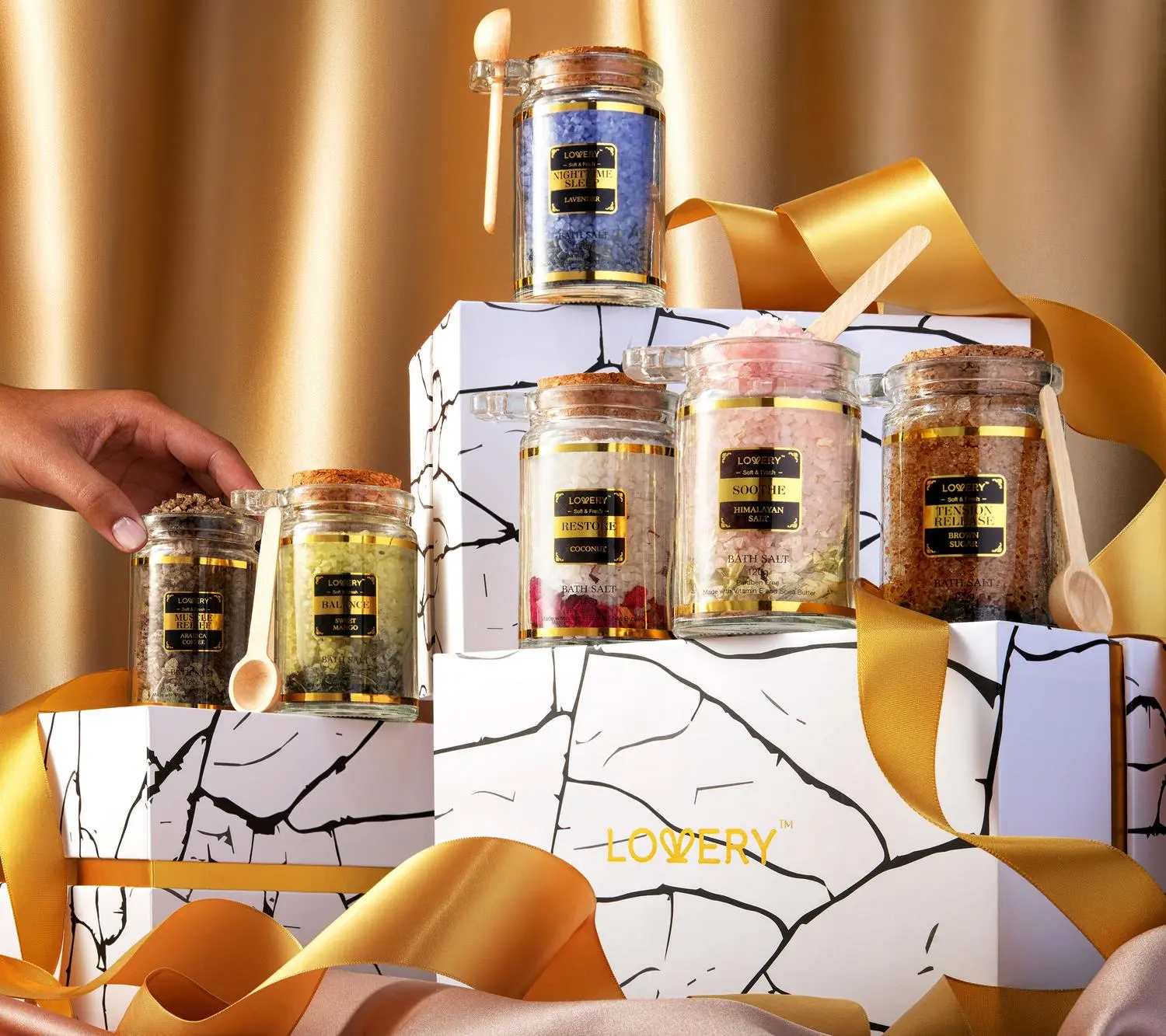 Give the gift of luxury and relaxation to your loved ones with Lovery’s Deluxe Bath Salts! Each Salt comes in a Crystal Jar & contains 120 grams of Lavender Bath Salt, Arabica Coffee Bath Salt, Sweet Mango Bath Salt, Brown Sugar Bath Salt, Himalayan Bath Salt, and Coconut Bath Salt – packed in an Elegant Marble and Gold Gift Box. Each Jar comes with its own Wooden Scoop for easy use, Glass Jar for elegant decor & Cork Cover to preserve the fragrance.