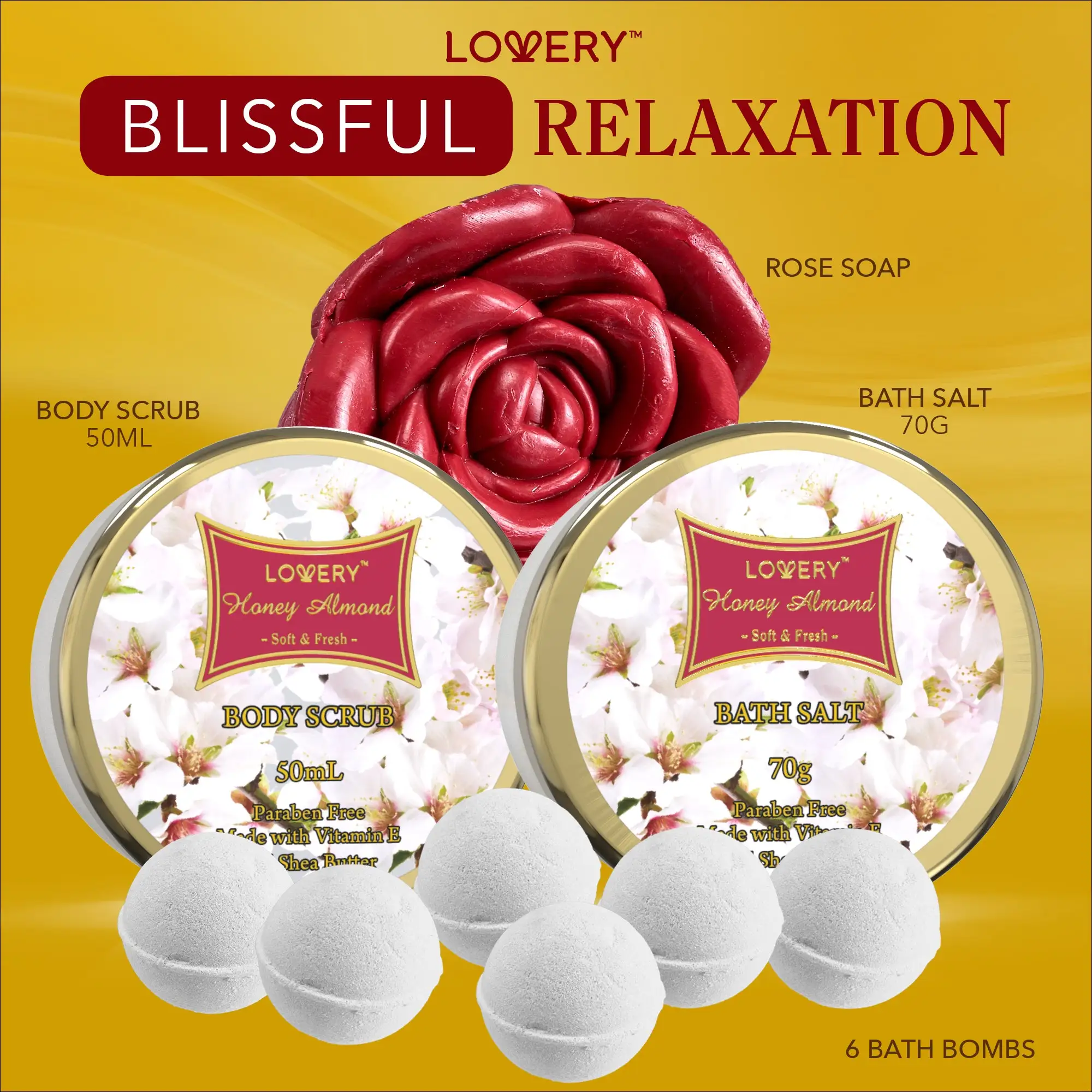 - SKIN SAVING ALMOND OIL – These bath and body cosmetics are infused with sweet almond oil and honey, not only giving you a most pleasant and invigorating fragrance, but it is the best thing you do for your skin! Rich in vitamin E, it keeps skin cells healthy, helps retain moisture and can even help protect your skin from UV ray damage!