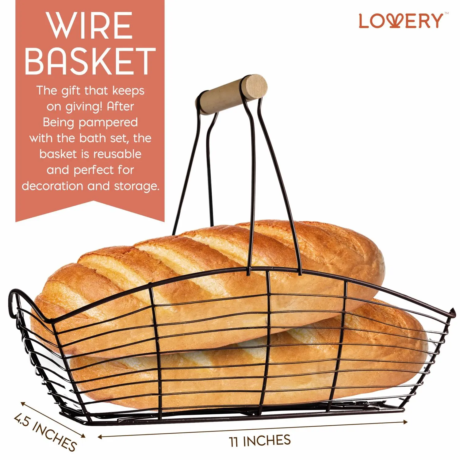 This spa gift basket has everything a woman needs! It includes Shower Gel, Bubble Bath, Shampoo, Body Lotion, Body Scrub, Bath Salt, Rose Bath Soap, Loofah Back Scrubber, Rose Bath Bomb, Bath Towel, Moisturizing Shower Gloves. Packed in a stunningly wrapped Wired Bread Basket, it also has a gift note card for you to personalize it.