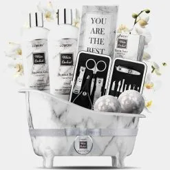 This Aromatherapy Gift is full-packed with all the essentials you will need for a deluxe spa experience. Each tub contains: Shower Gel, Bubble Bath, 2x Huge Marble Bath Bombs, 13pc Manicure and Pedicure Nail Care Set, Leather Nail Kit Holder, Bath Salts, Personalized Greeting Card “You Are The Best”, wrapped in a Marbleized Tub with a Ribbon and Hangtag for easy gifting