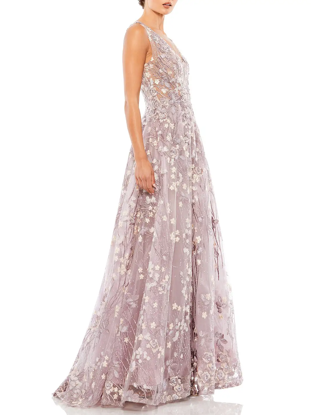 Gorgeous floral embroidered lace A-line gown, accented with crystals throughout. Neckline features sheer mesh inset mid-bust.
