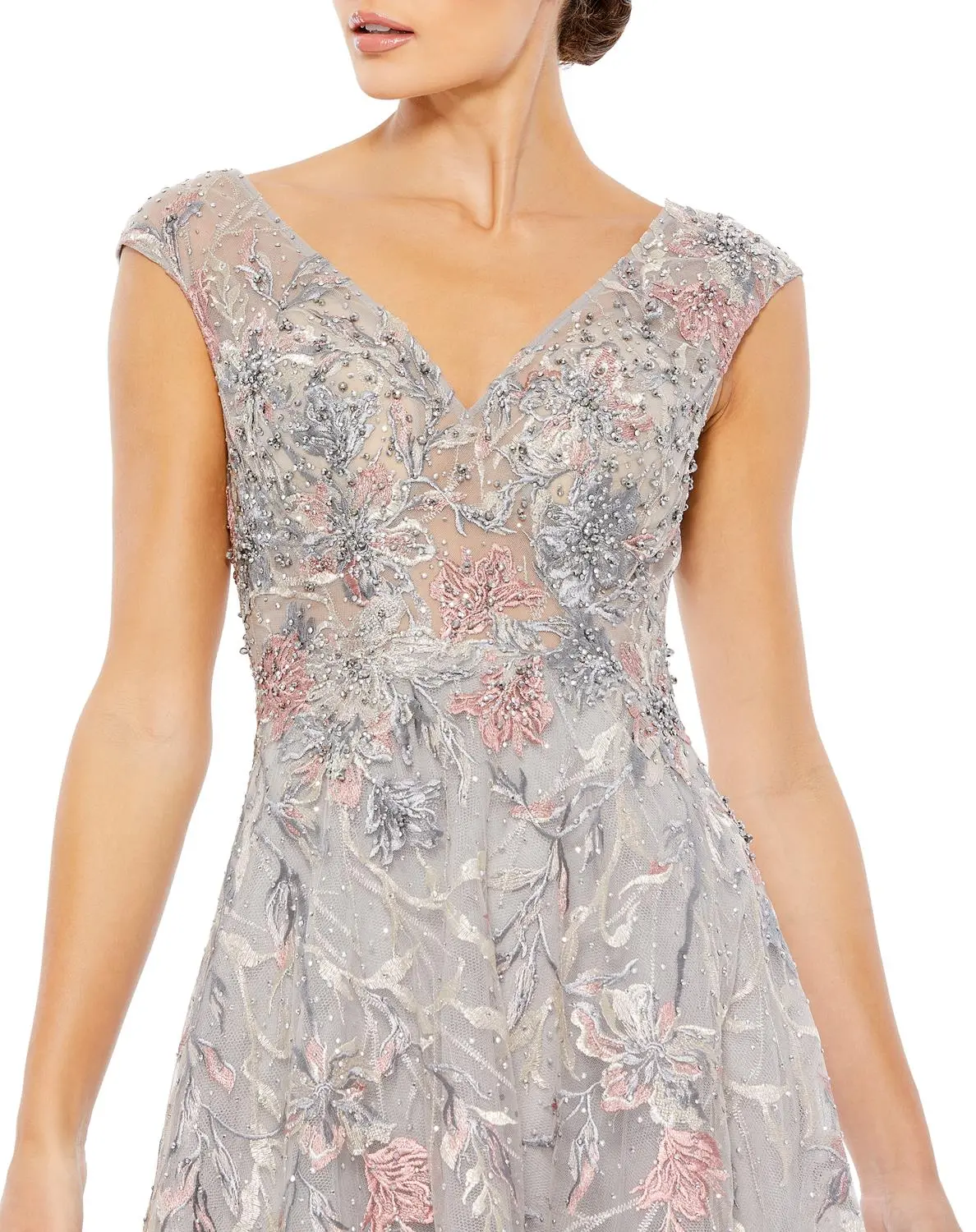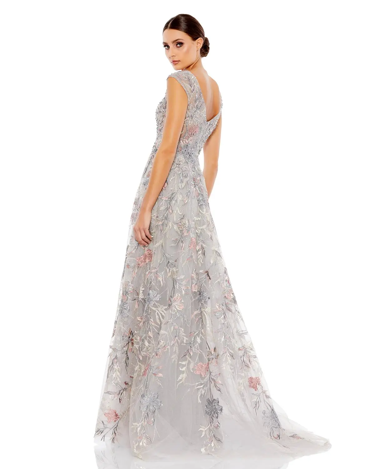The embroidered look and out-of-this-world styling of this gown will set you apart as the belle of any ball.