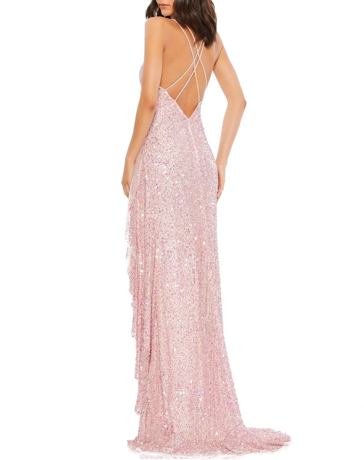 Sequin-embellished gown accented with asymmetrical ruffles across the bodice and skirt, a daring thigh-high slit, and strappy back.