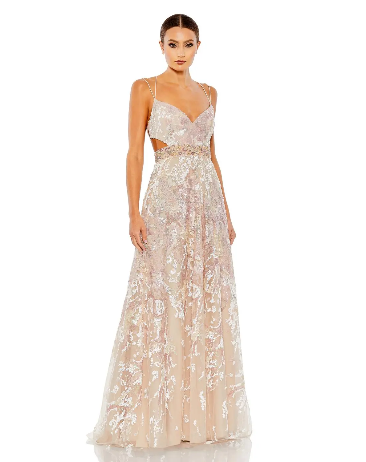 Fulfill your dreams of the perfect evening dress with this dazzling gown from Mac Duggal. Sleeveless construction with cutout silhouette, maxi length and an allover metallic lace that shines when you move.