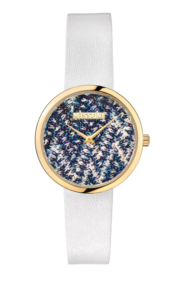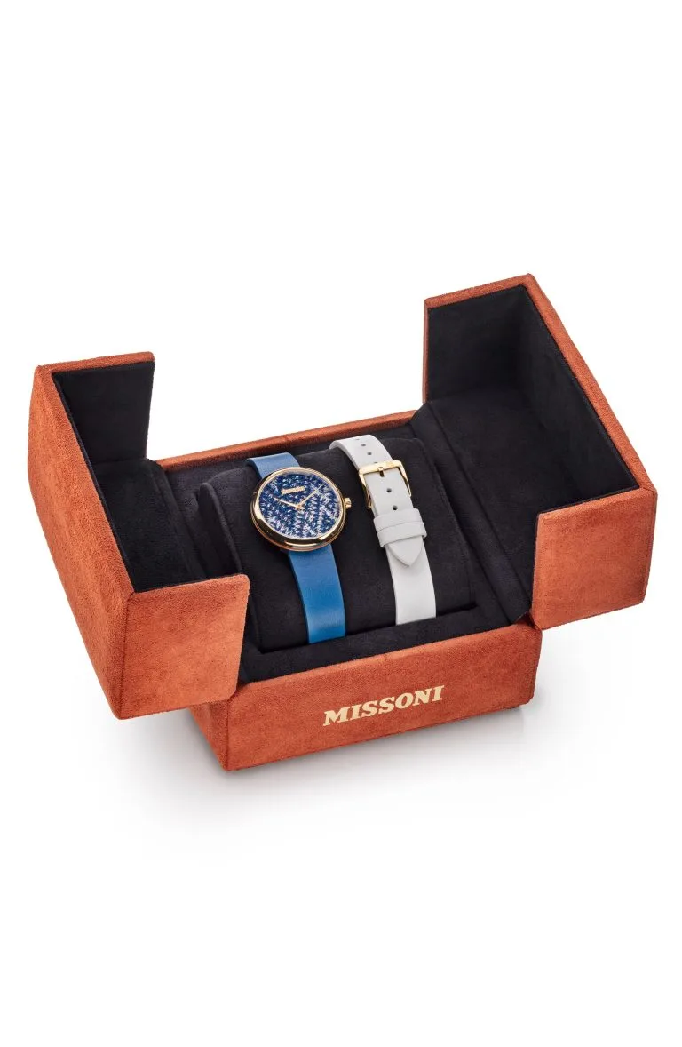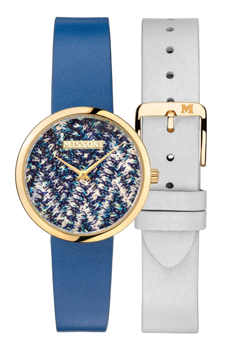 The new Missoni M1 timepiece collection features a unique combination of steel and yellow gold tones for an elegant and graceful appearance. This gift set contains the iconic Missoni zigzag knit fabric on the dial in a palette of vivid colors inspired by the blue orchid, lily and azalea.
