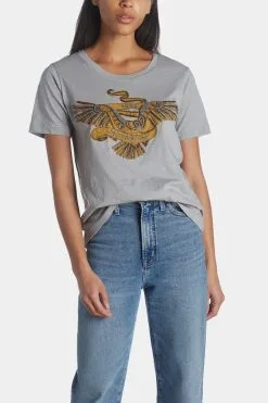 Add some edginess to your outfit with this tee. It’s crafted from cotton and designed in a regular silhouette with o-neck and short sleeves. This tee is finished with hand beaded eagle artwork at front and looks great with a pair of jeans and chunky boots.