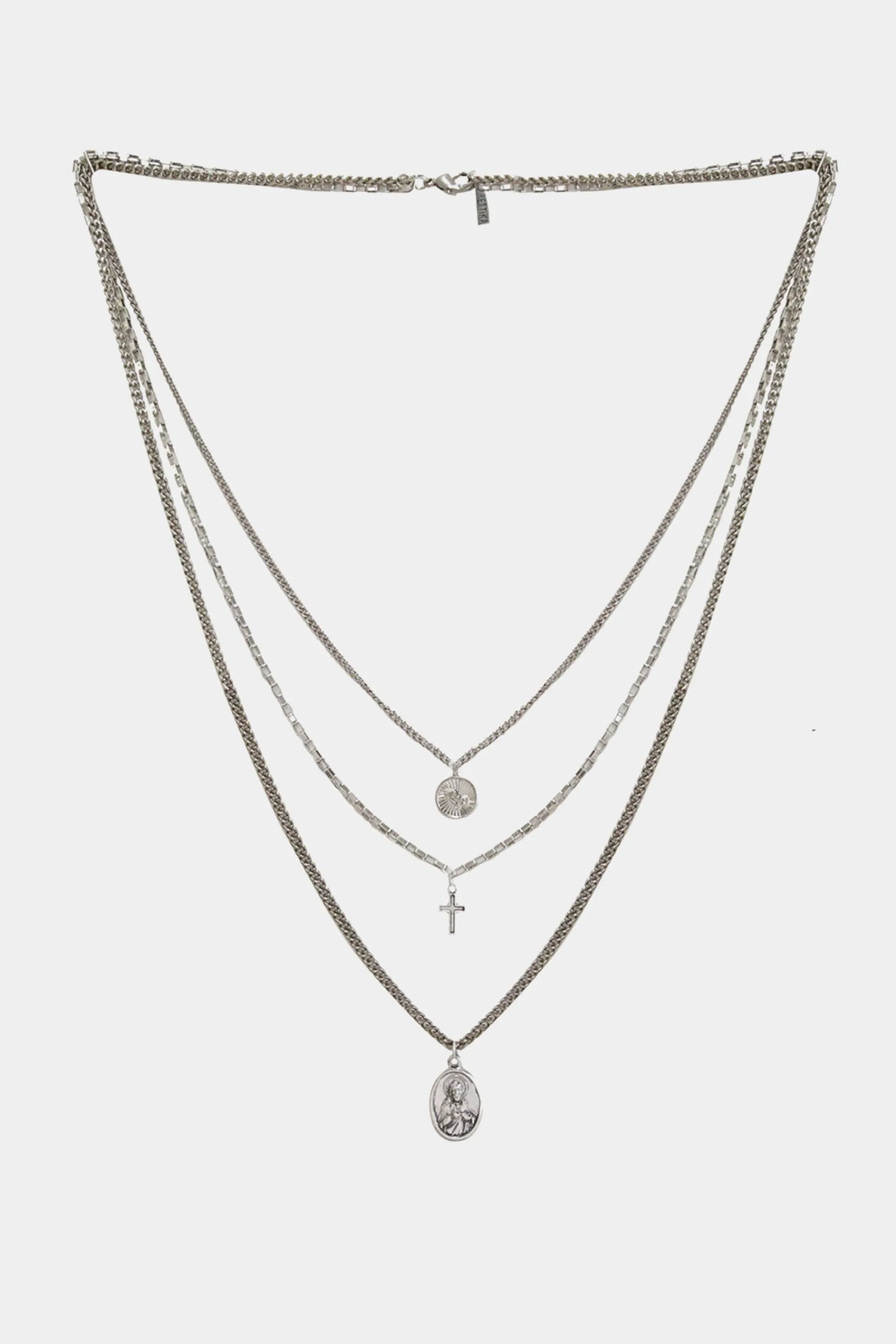 Add a unique flair to your look and elevate your everyday style with the Triple Layered Antique Silver Necklace that features religious symbol pendants.