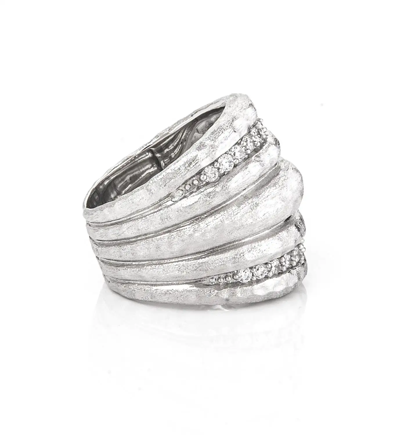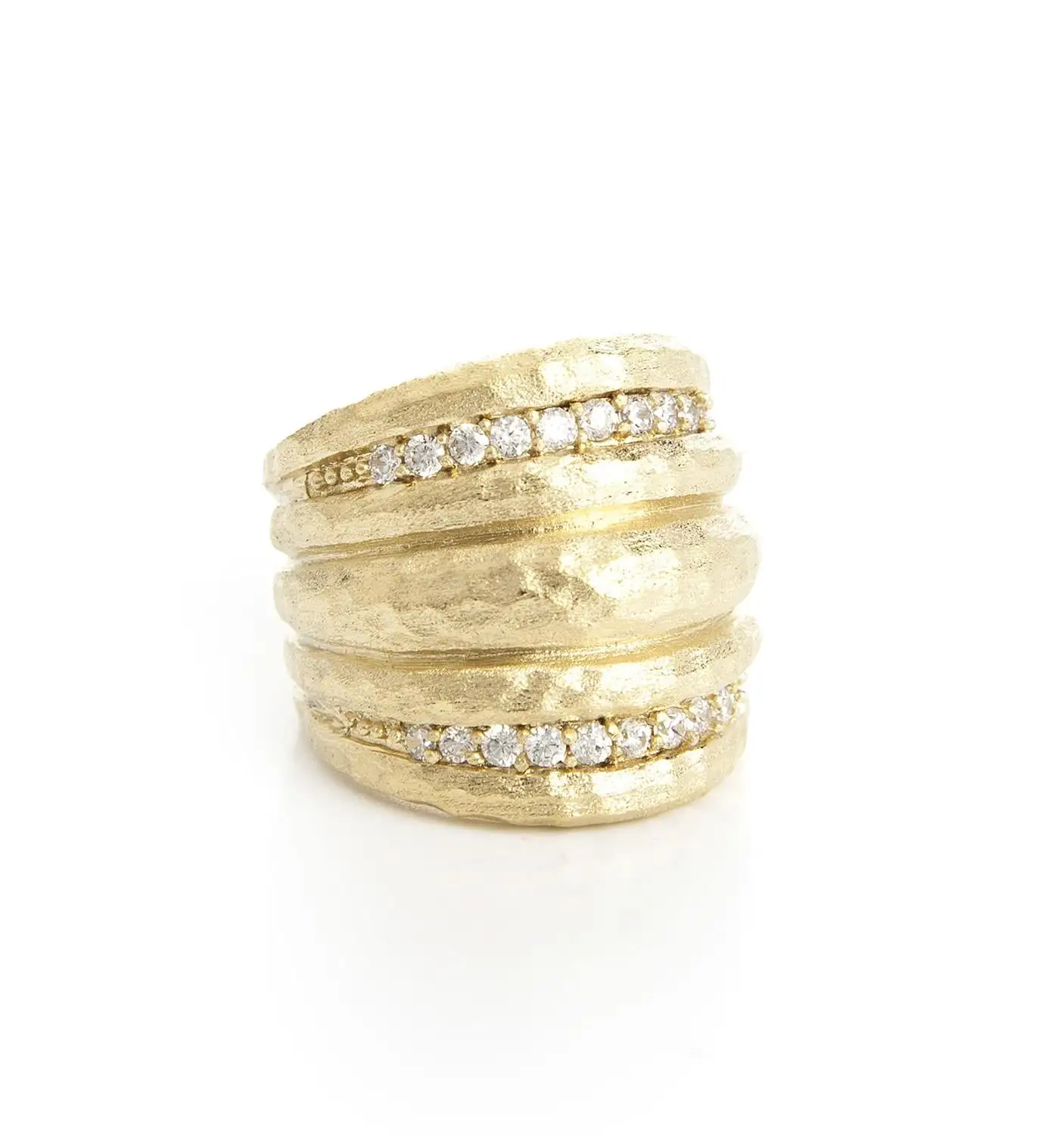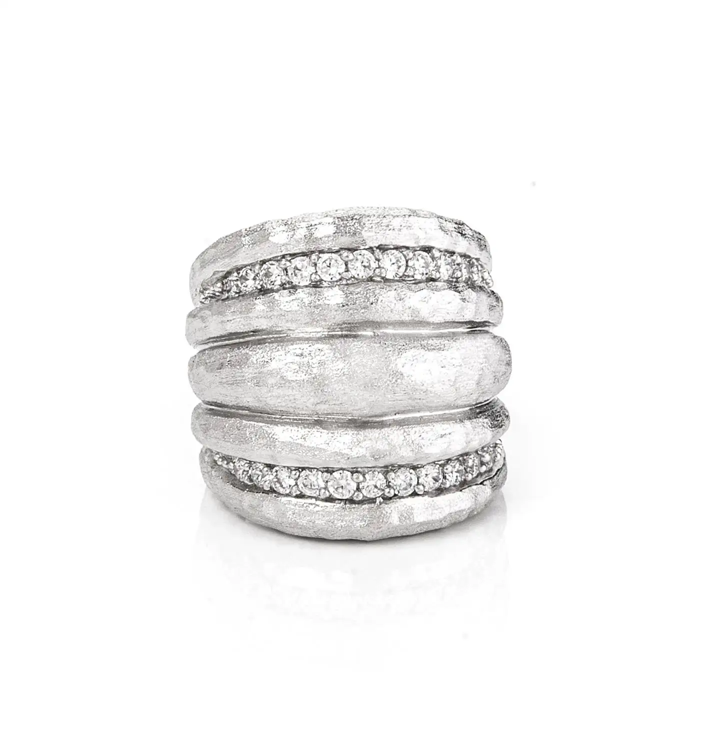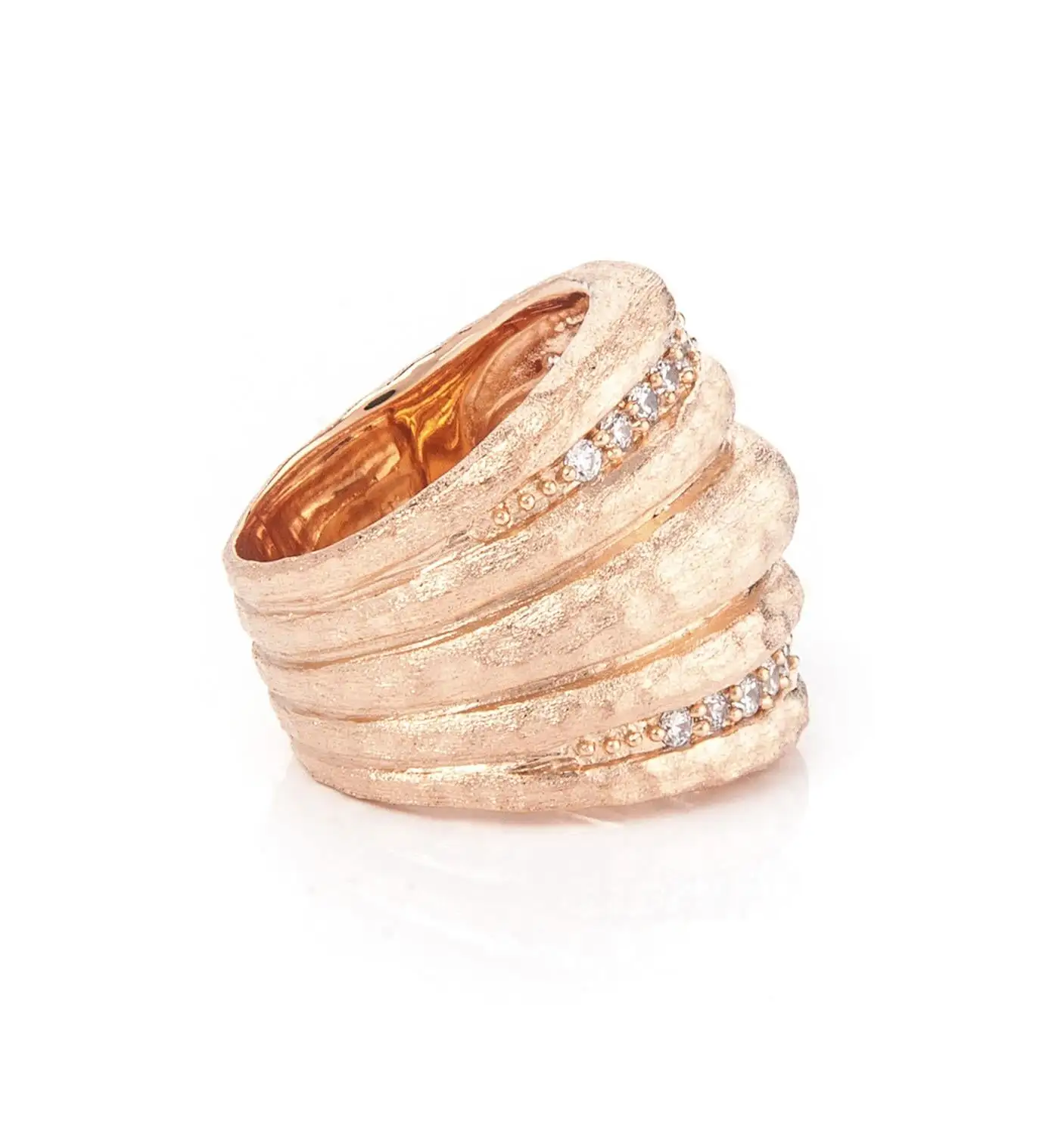 This 18K Rose Gold Clad Rich Satin Finish Ring Features Two Rows of Hand Set Cubic Zirconia Stones in a wide band style.
