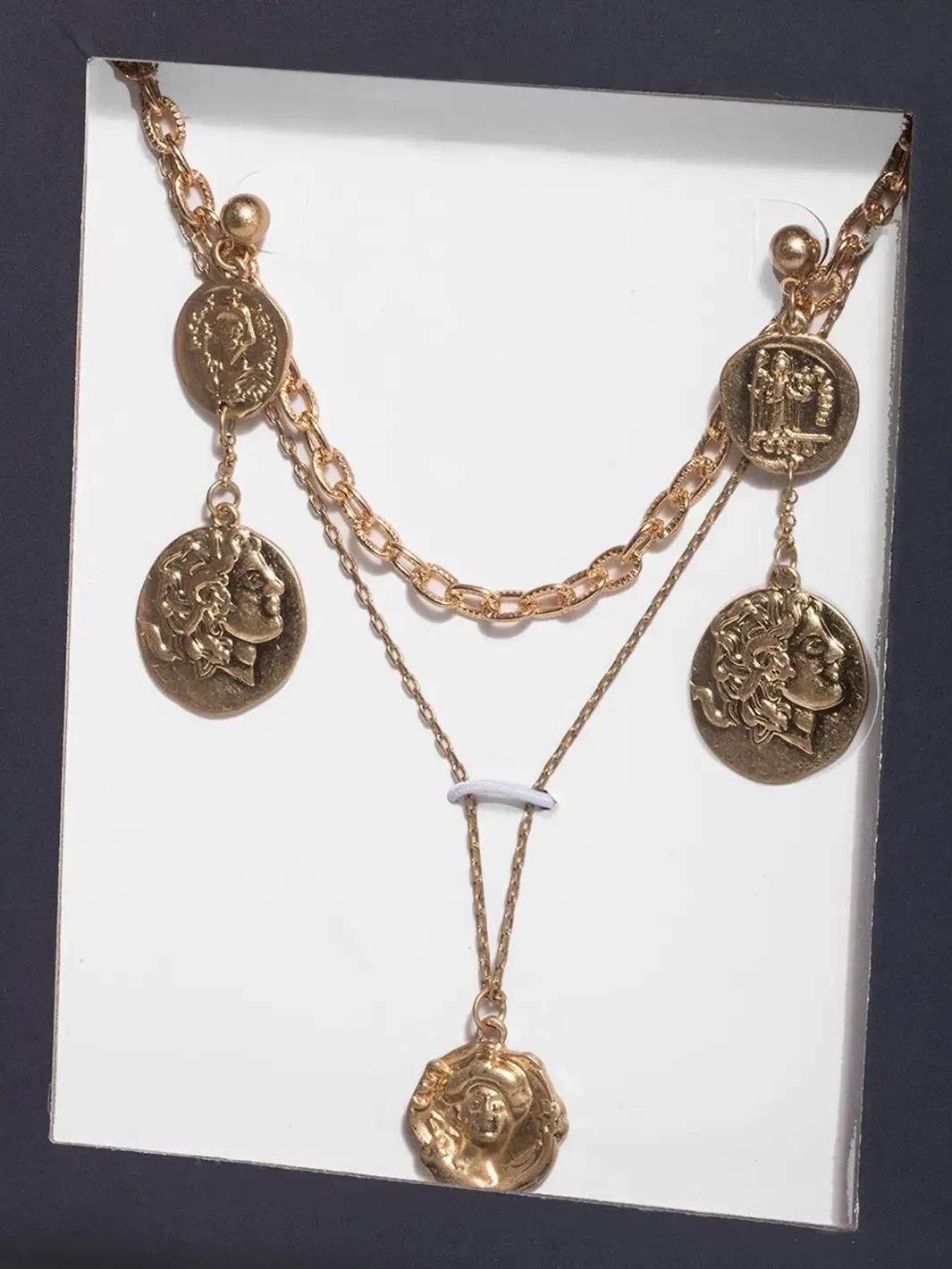 Our Coin Necklace and Earring gift set is a signature Saachi item, perfect to wear out in a shimmering gold with a classic ancient feel.