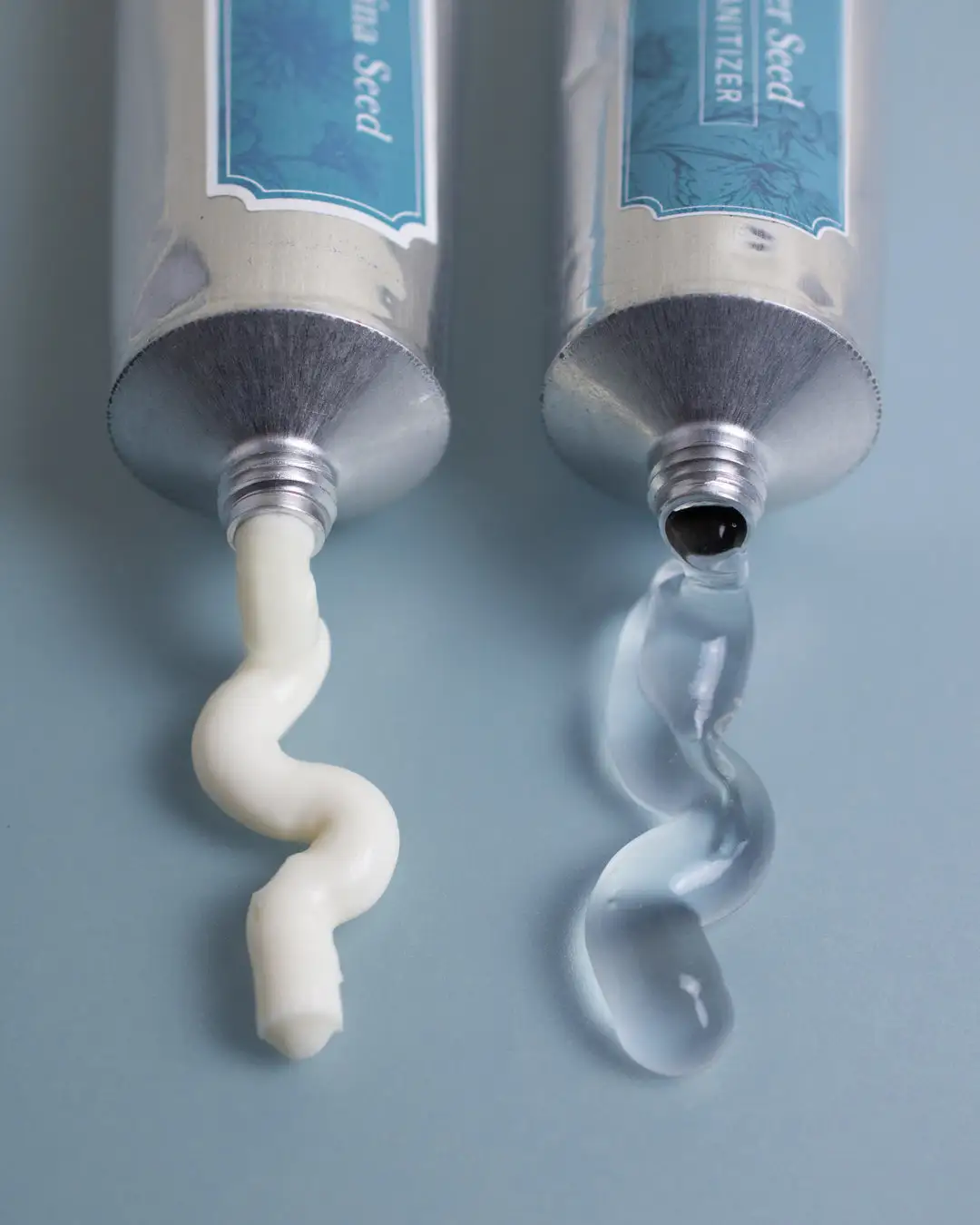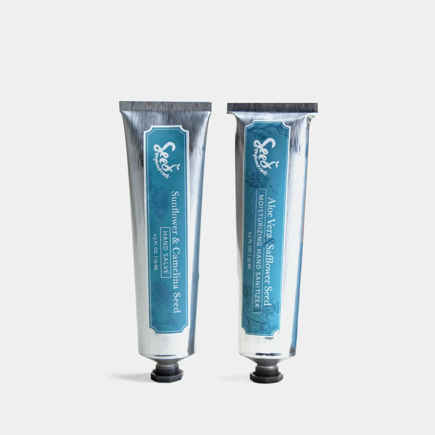 Try two Seed Phytonutrients formulas most coveted by the hands of their community! Sanitize without over-drying with luxurious, aloe vera-infused Moisturizing Hand Sanitizer. Double up on the moisture with cult favorite Hand Salve, rich in shea butter and nourishing seed oils to transform roughness and dryness into supremely soft skin. Consciously packaged in recyclable aluminum tubes, on-the-go gym bag, purse, and travel must-haves!