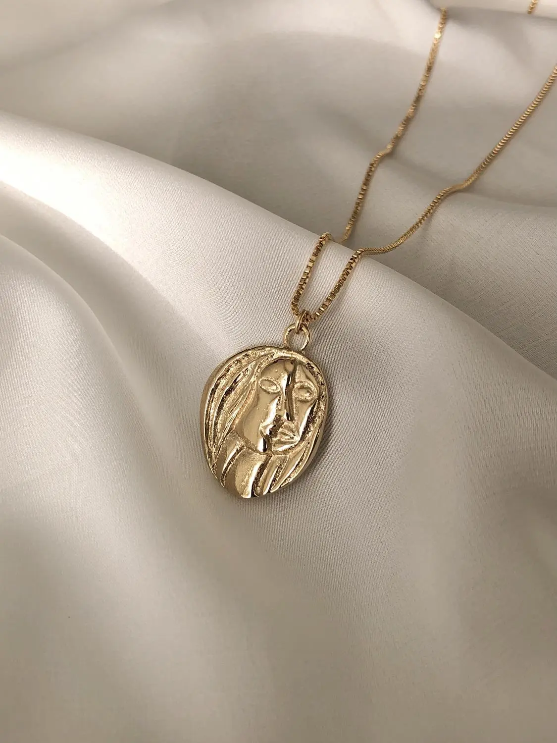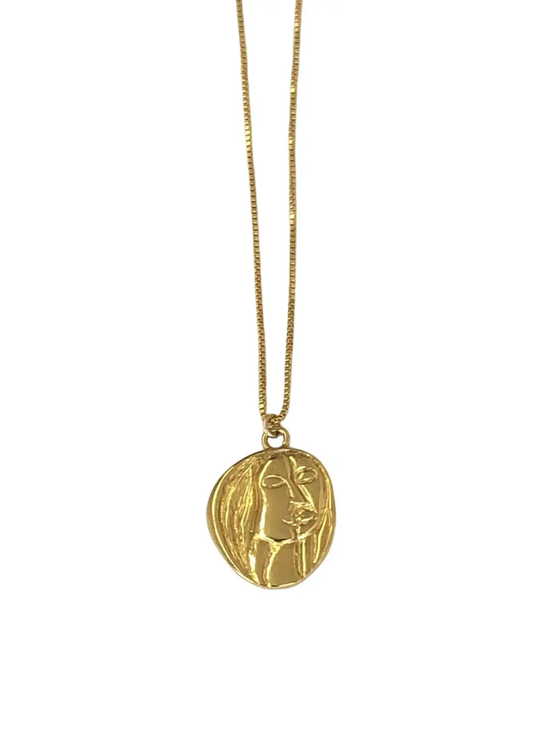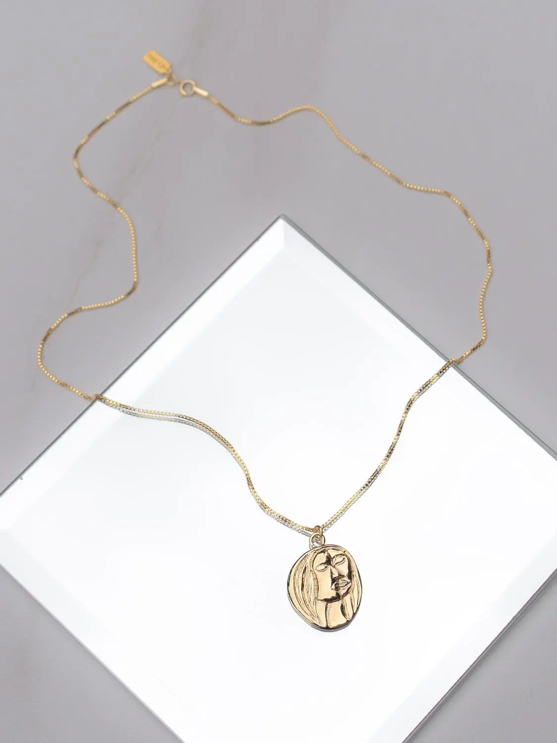 - 14k gold fill box chain w/ 24k gold over brass 22mm abstract face pendant.