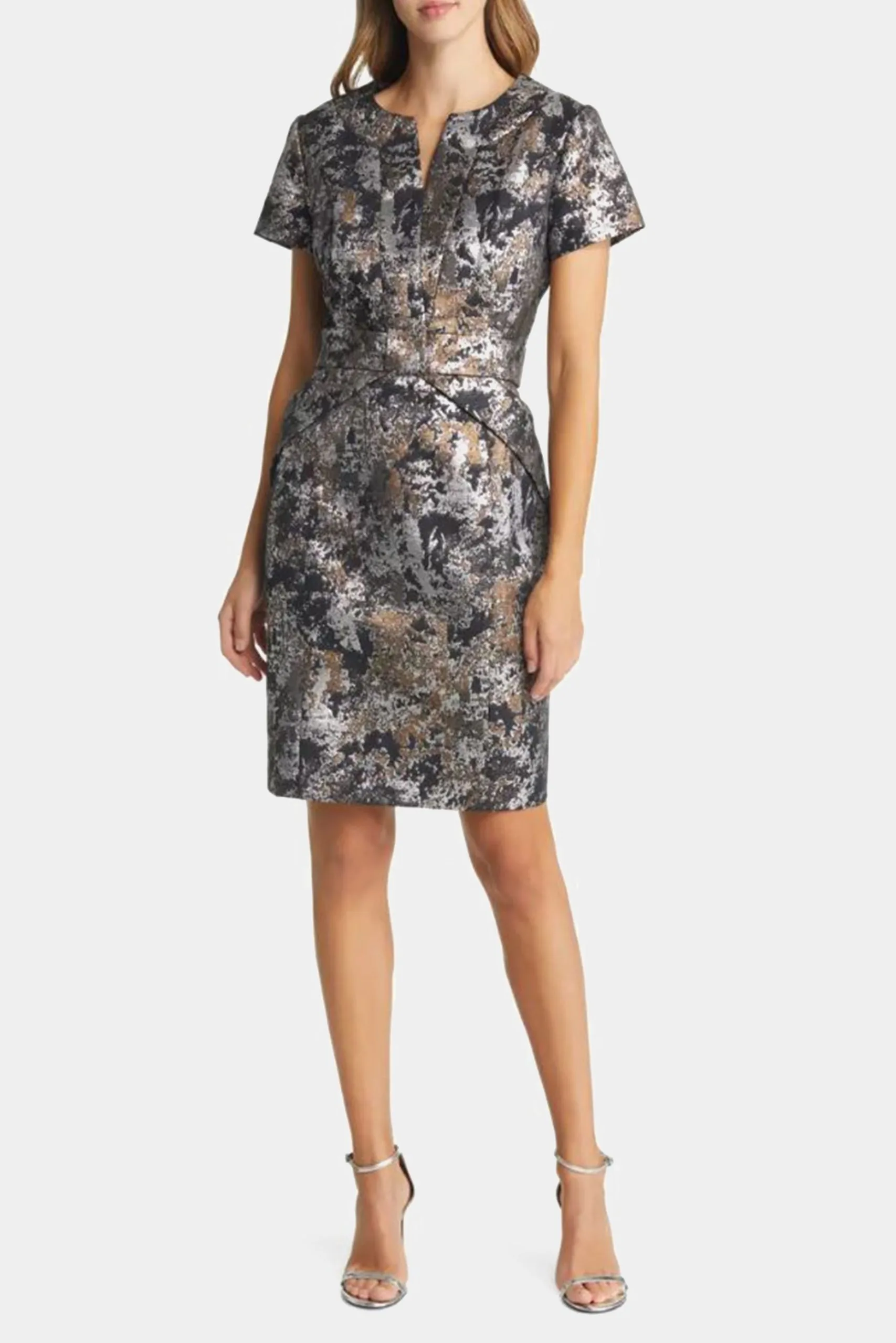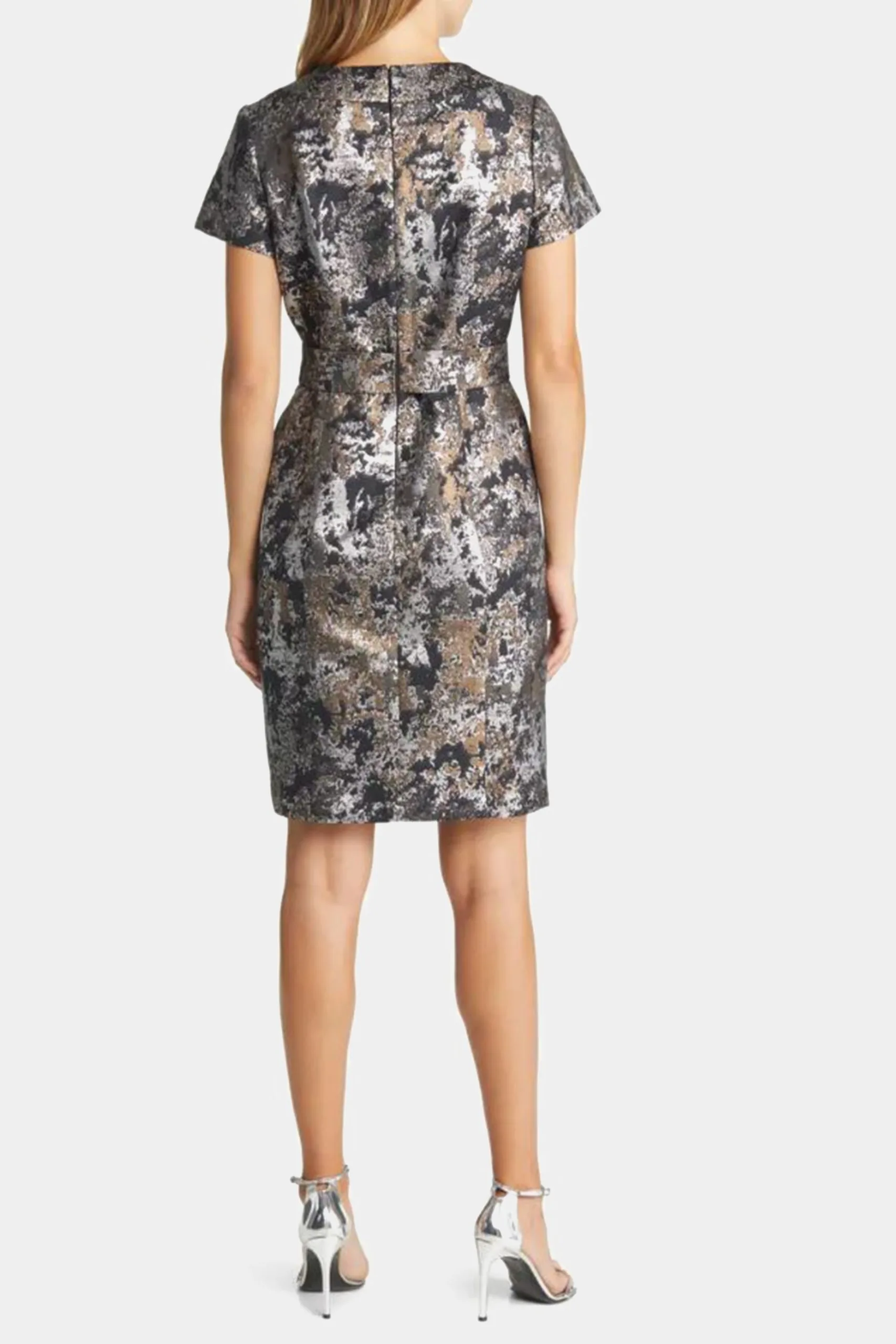 - Short Sleeves, Bow Detail at Waist, V-neck, Invisible Zipper, Jacquard