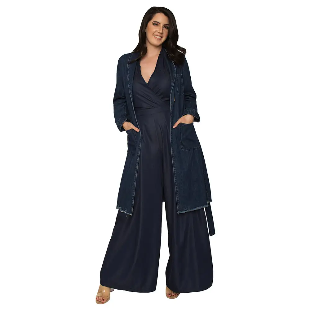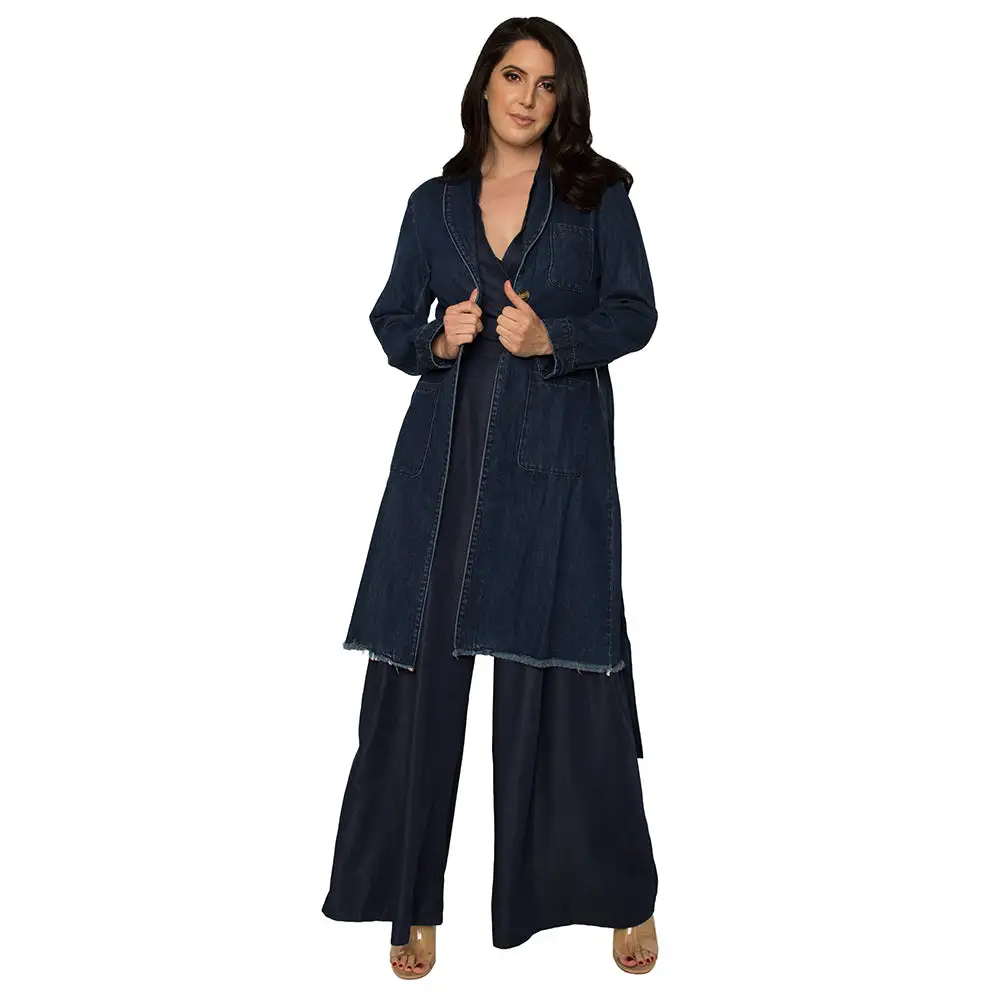 This refined denim robe jacket is a classic evergreen women’s trend in fashion. You can never go wrong with this one! Couple it up with a midi dress, calf length boots and spring fashion becomes you!