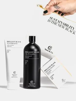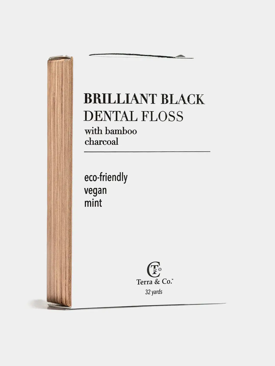 - Brilliant Black Dental Floss 32 yards – Sturdy bamboo fiber charcoal-infused dental floss with an ever-so-gentle peppermint flavor and easy vegan glide