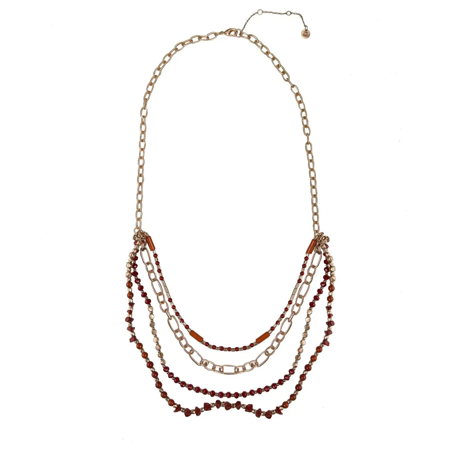 We love layering pieces. Dress up an outfit with this silver tone and assorted rust bead multi row necklace from The Sak.
