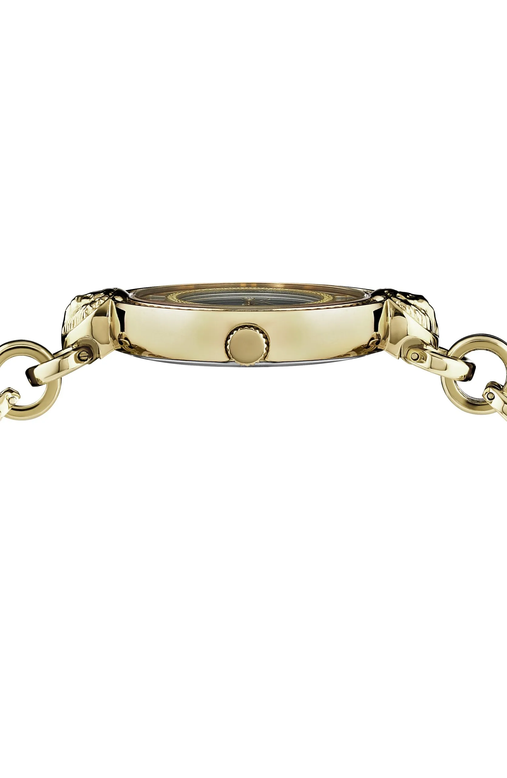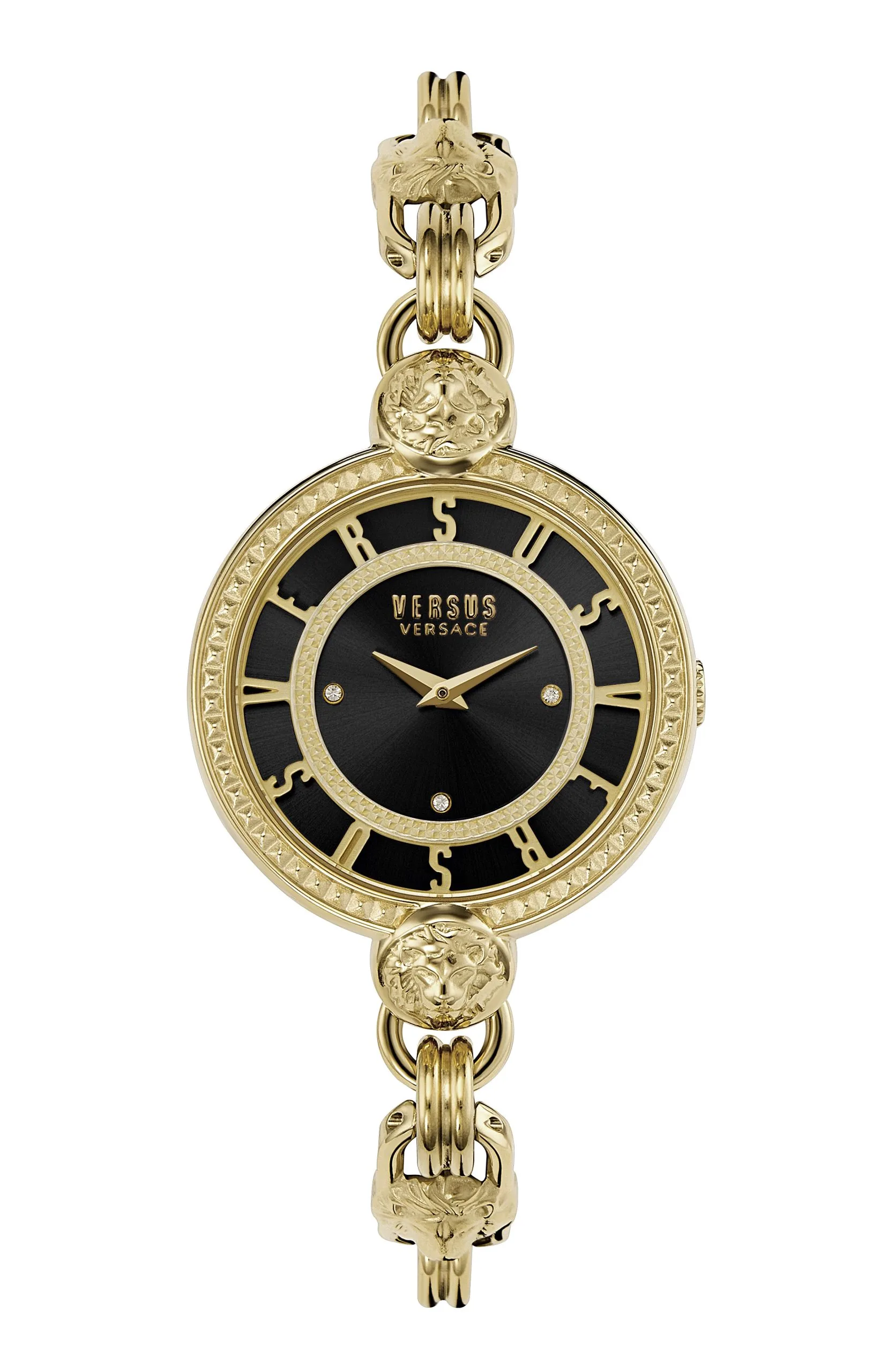 Versus Les Docks is a jewelry inspired timepiece featuring interconnected lion heads to create a rich and precious bracelet. Versus text is used as indexes on the dial giving this watch a very sophisticated look.