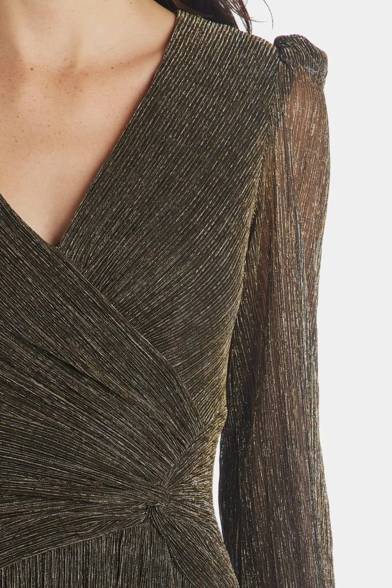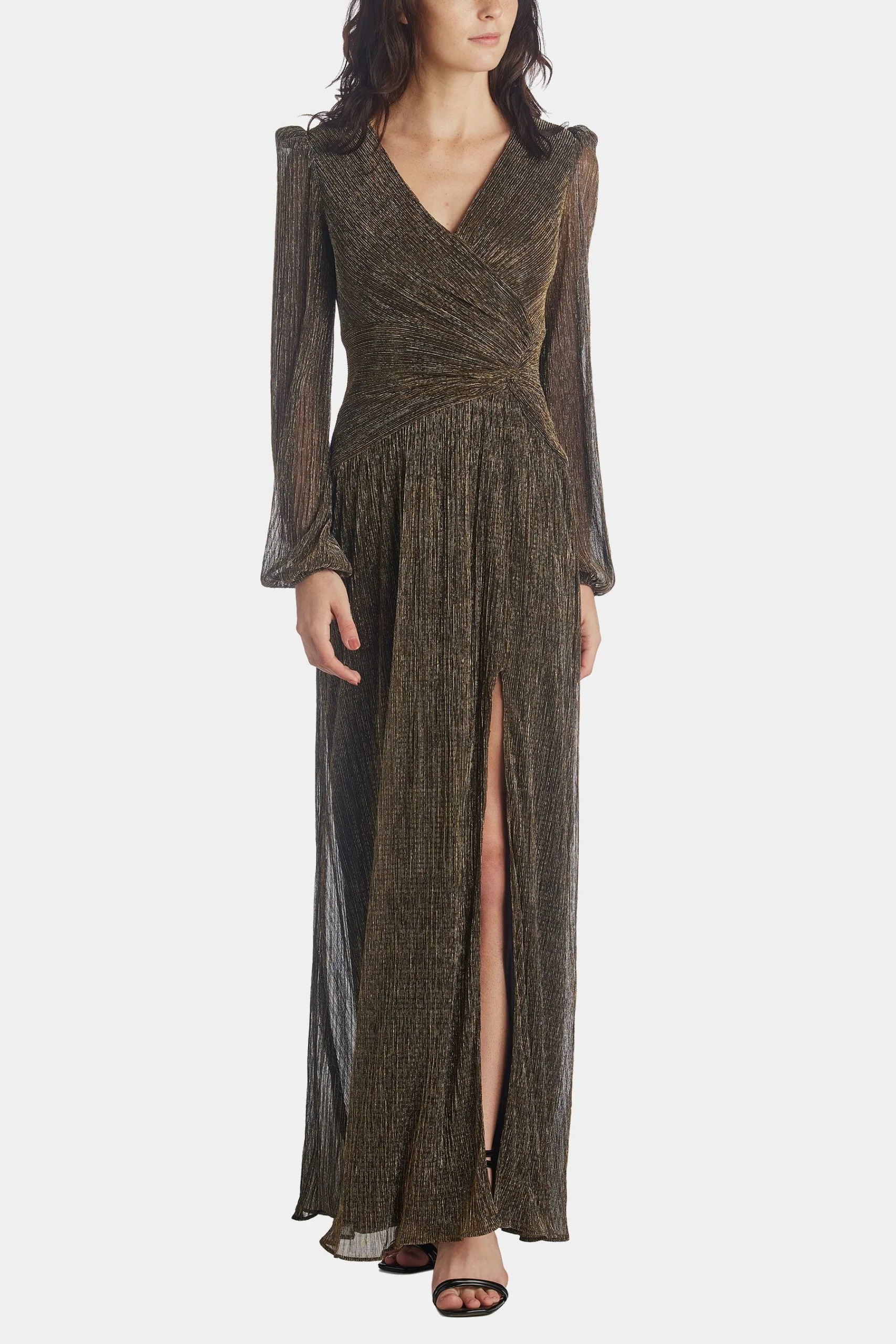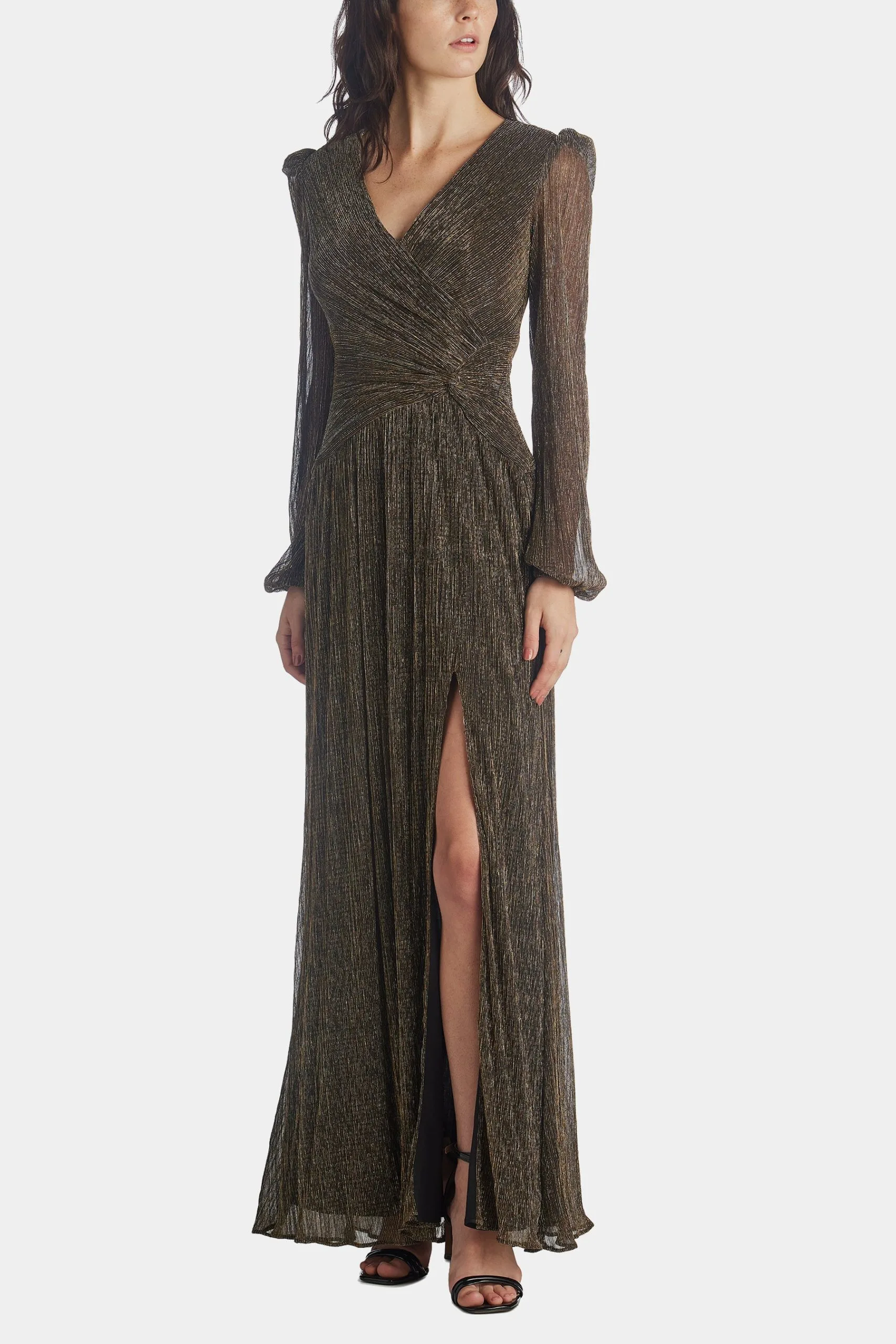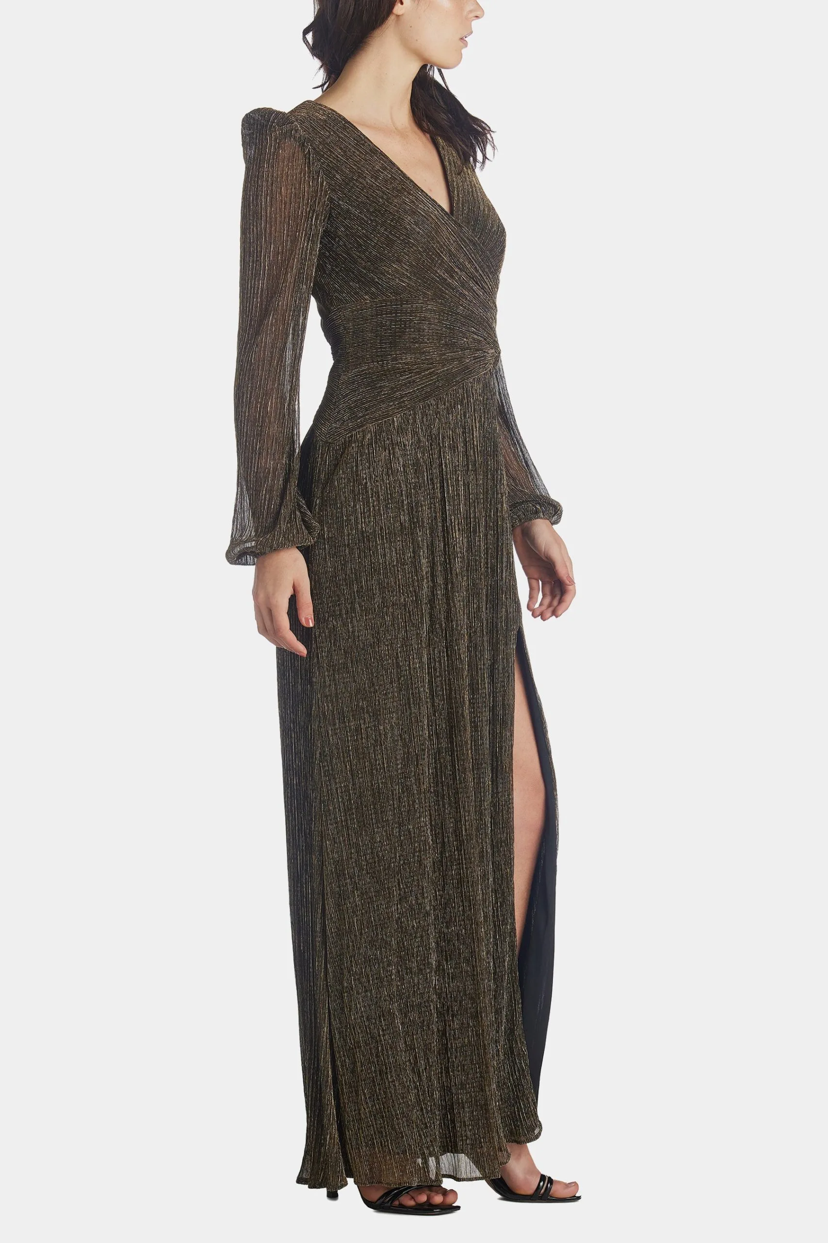 A beautifully long, long sleeve metallic wrap gown. We love this for prom, bridesmaids and of course fancy black-tie parties.