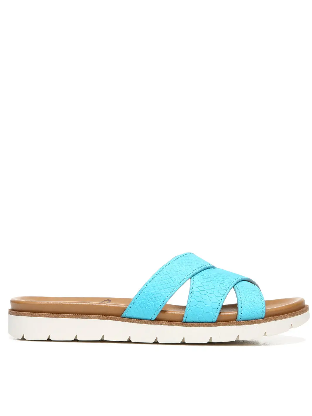 Easy does it with this carefree, modern slide sandal. Suede or leather upper. Interwoven straps. Slip on styling. Open toe. Extra arch and heel cushioning for comfort with every step. 3/4 inch heel. Synthetic treaded outsole.
