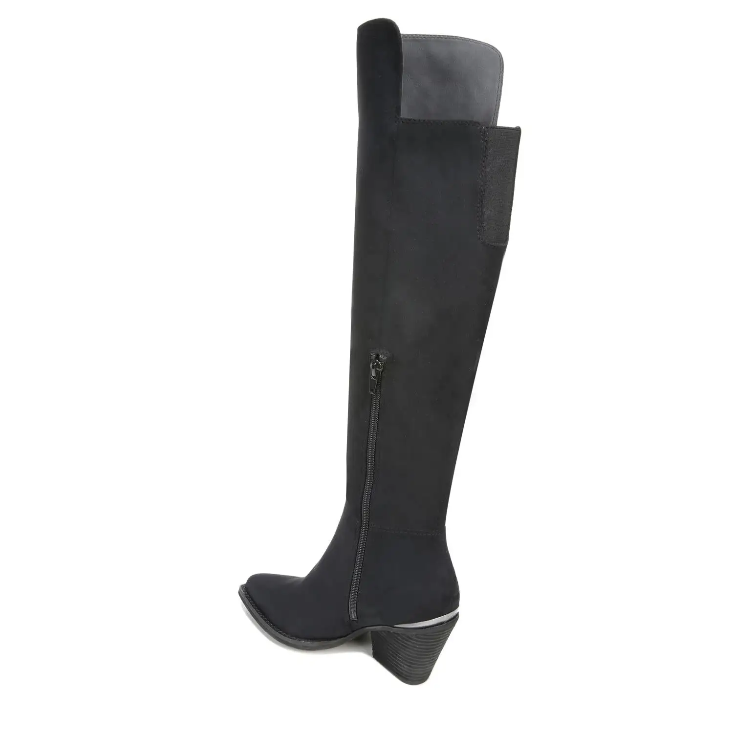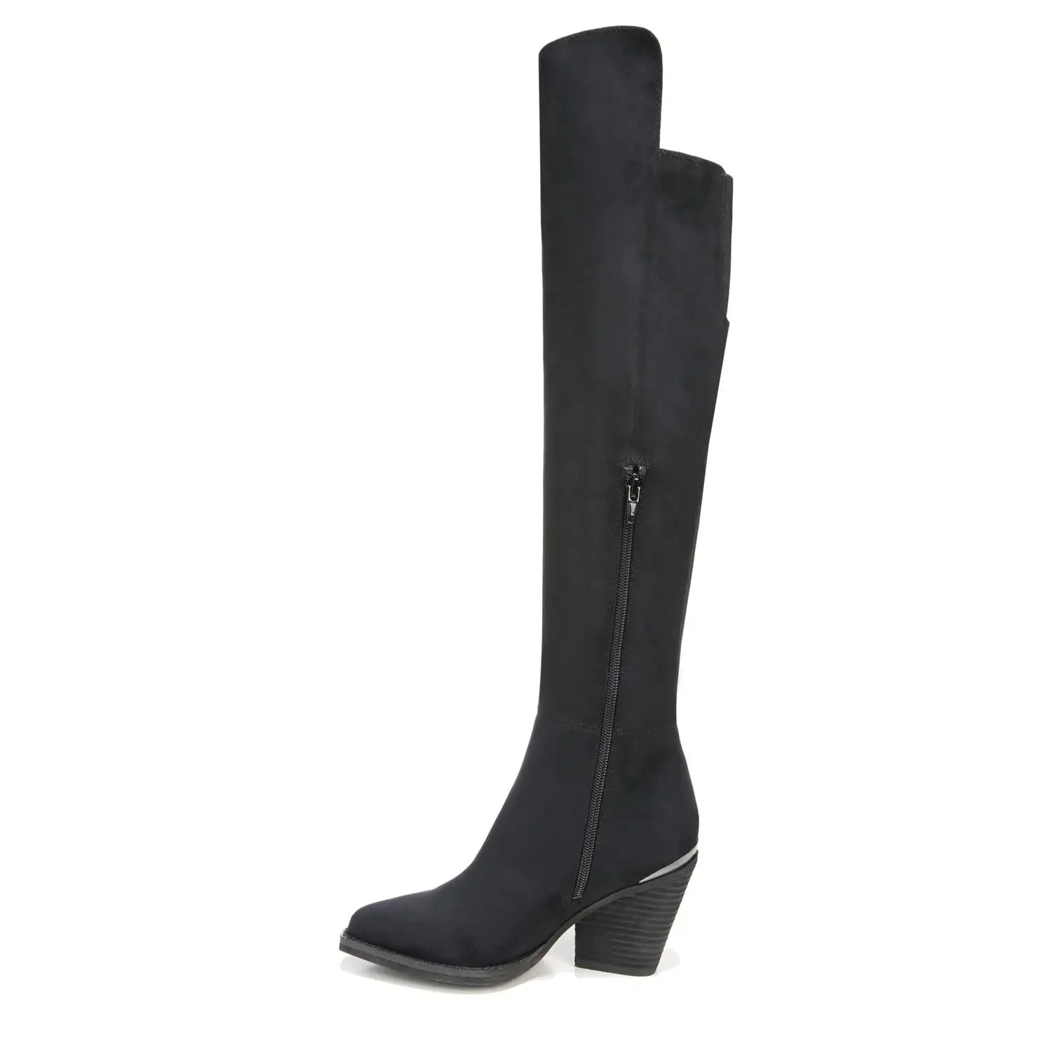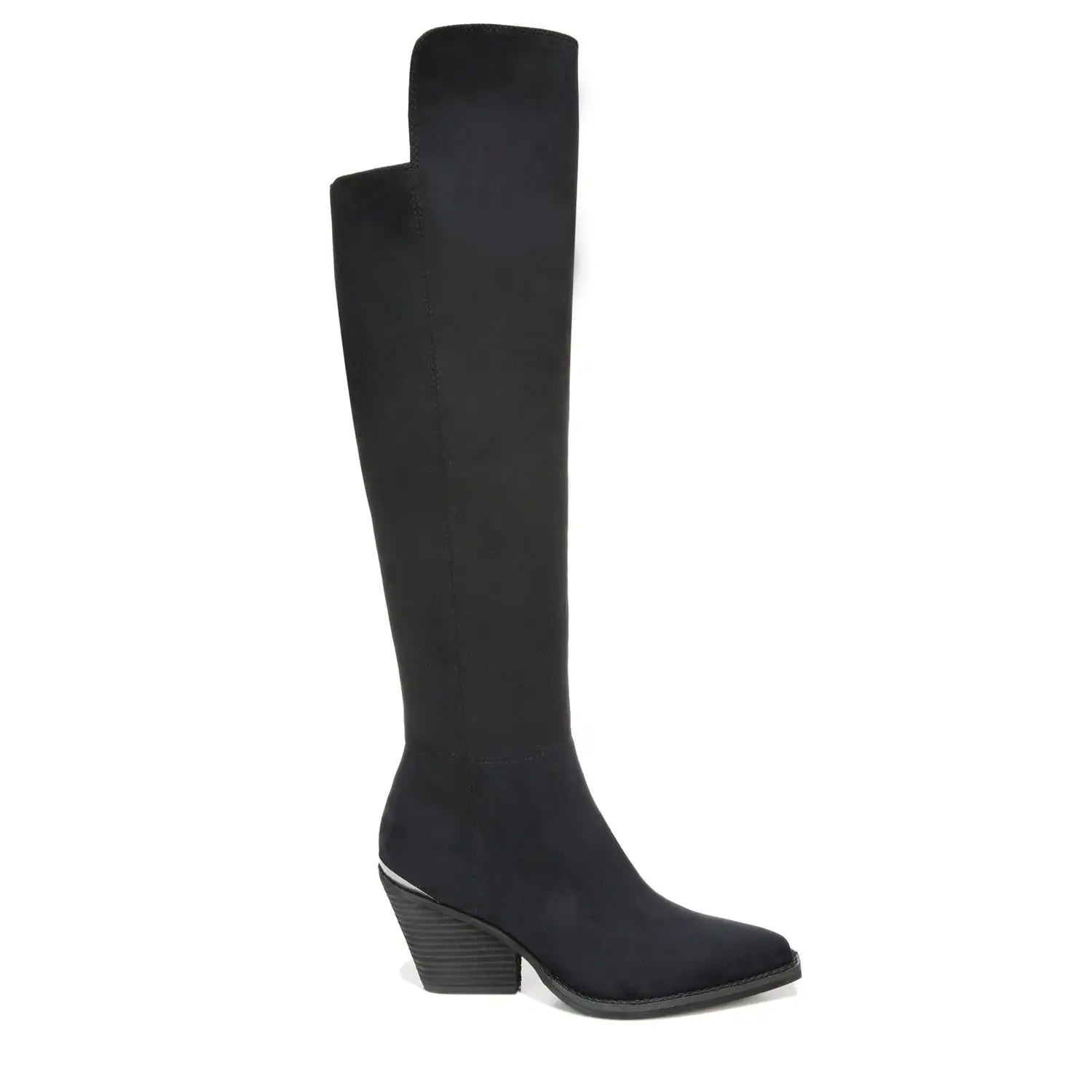 Blaze a new trail. This tall western-inspired boot makes for a brilliantly bold addition to your closet. Faux leather or fabric upper. Side zip closure. Closed pointed toe. Extra arch and heel cushioning for comfort with every step. 2 1/2 inch stacked block heel. Synthetic outsole.